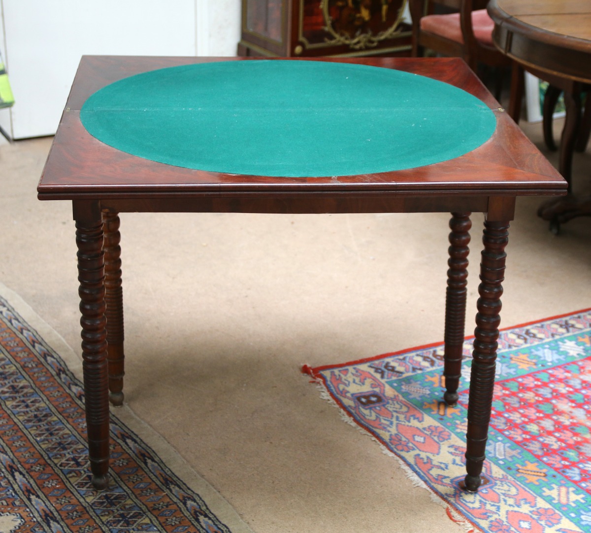 TABLE À JEU de forme rectangulaire en acajou et placage d'acajou. Elle repose sur quatre pieds tournés.