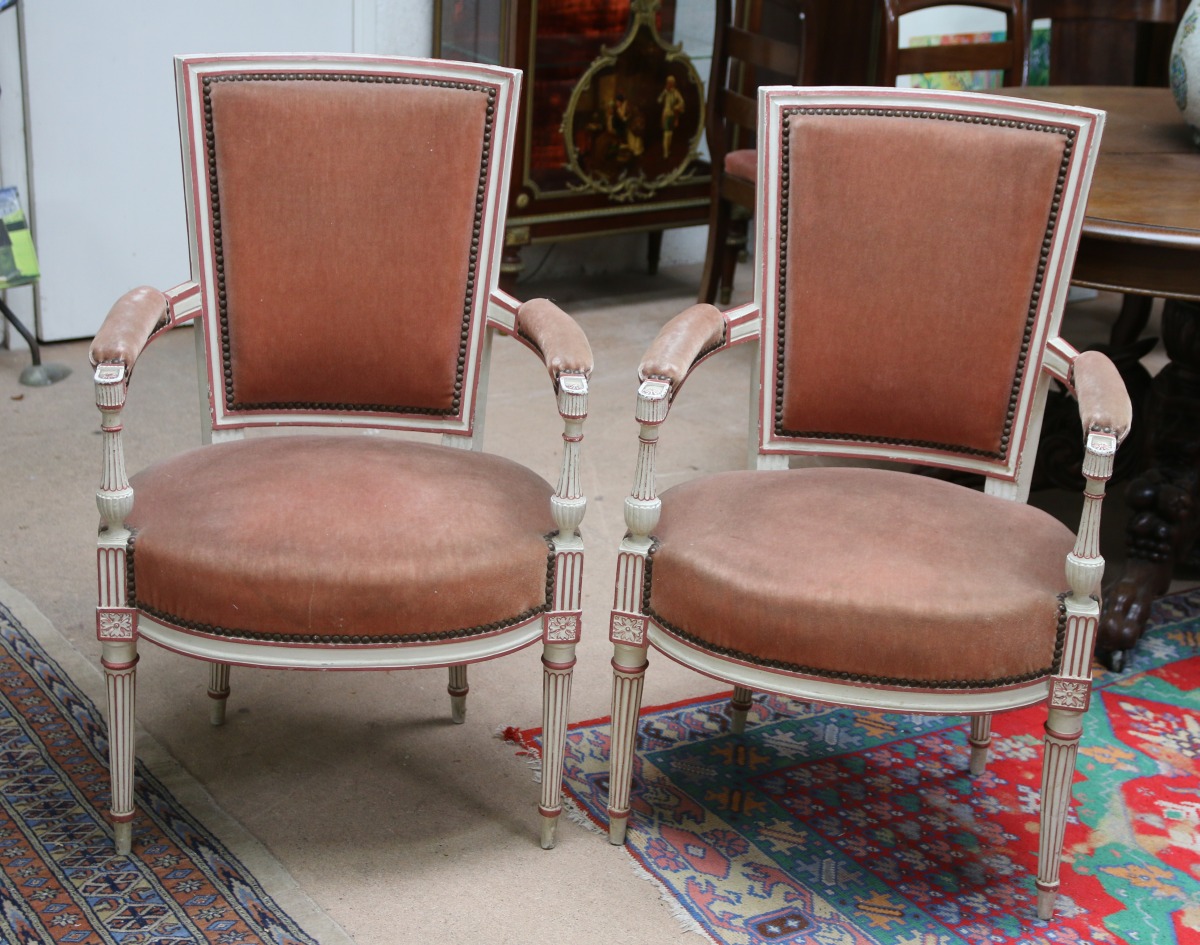 Paire de FAUTEUILS cabriolets en bois mouluré, sculpté et relaqué blanc et vieux rose. Consoles d'accotoir en balustre ornées de cannelures et de godrons, dés de raccordement à fleurons.