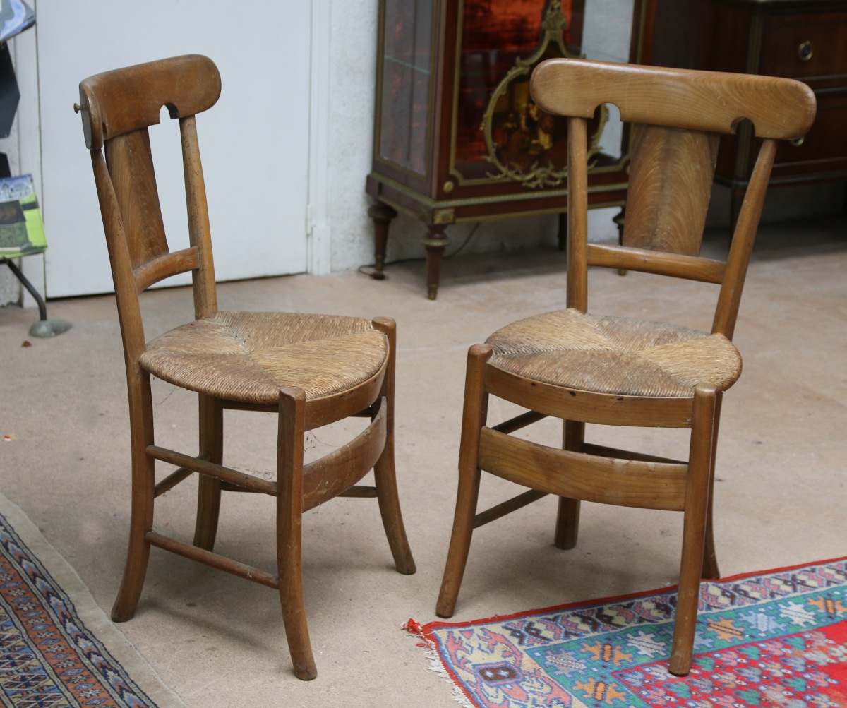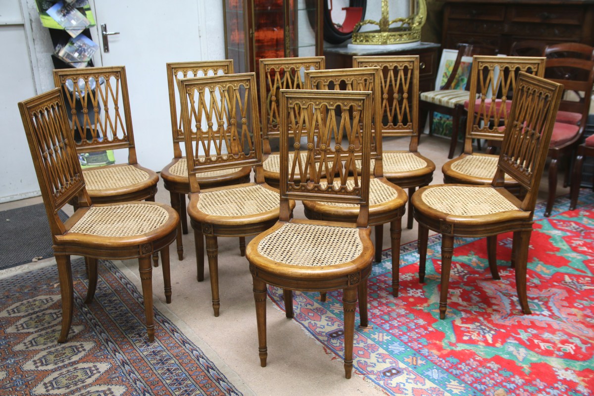 SUITE DE HUIT CHAISES de salle à manger en bois naturel mouluré et sculpté. Dossier de forme rectangulaire ajouré de croisillons. Assise paillée. Elles reposent sur quatre pieds, les pieds antérieurs fuselés à frise de dents de loup, les pieds postérieurs sabres.