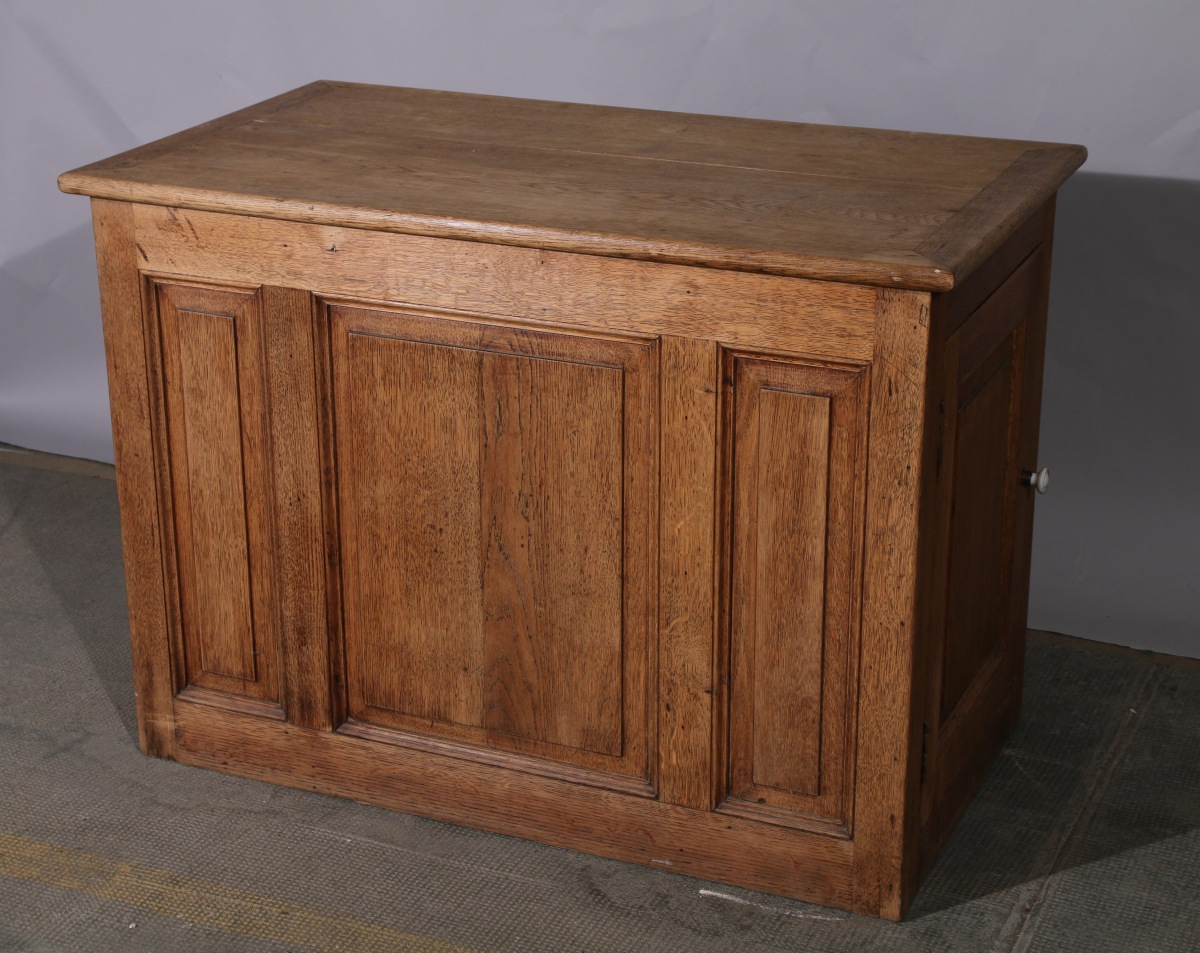 BUREAU D'ENFANT à CAISSONS de forme rectangulaire en chêne. Il ouvre en façade à deux tiroirs en ceinture et à deux vantaux latéraux. XXe.