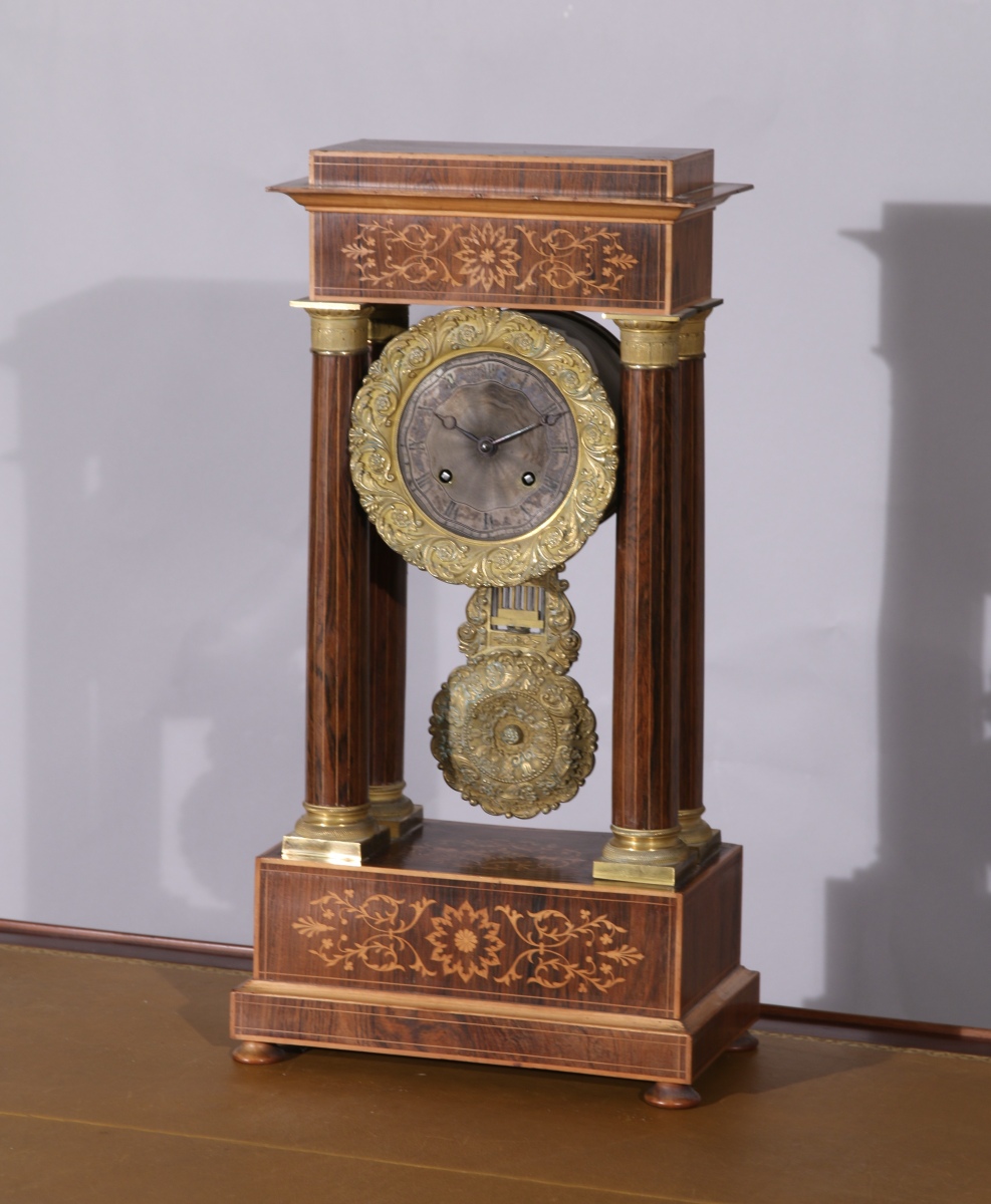 PENDULE portique en placage de palissandre marqueté de rosaces, feuillages et filets de bois clair. Garniture de bronzes ciselés et dorés tels que base et chapiteaux des colonnes, pourtour du cadran et balancier. Cadran en métal argenté indiquant les heures en chiffres romains. Mouvement à plaque.