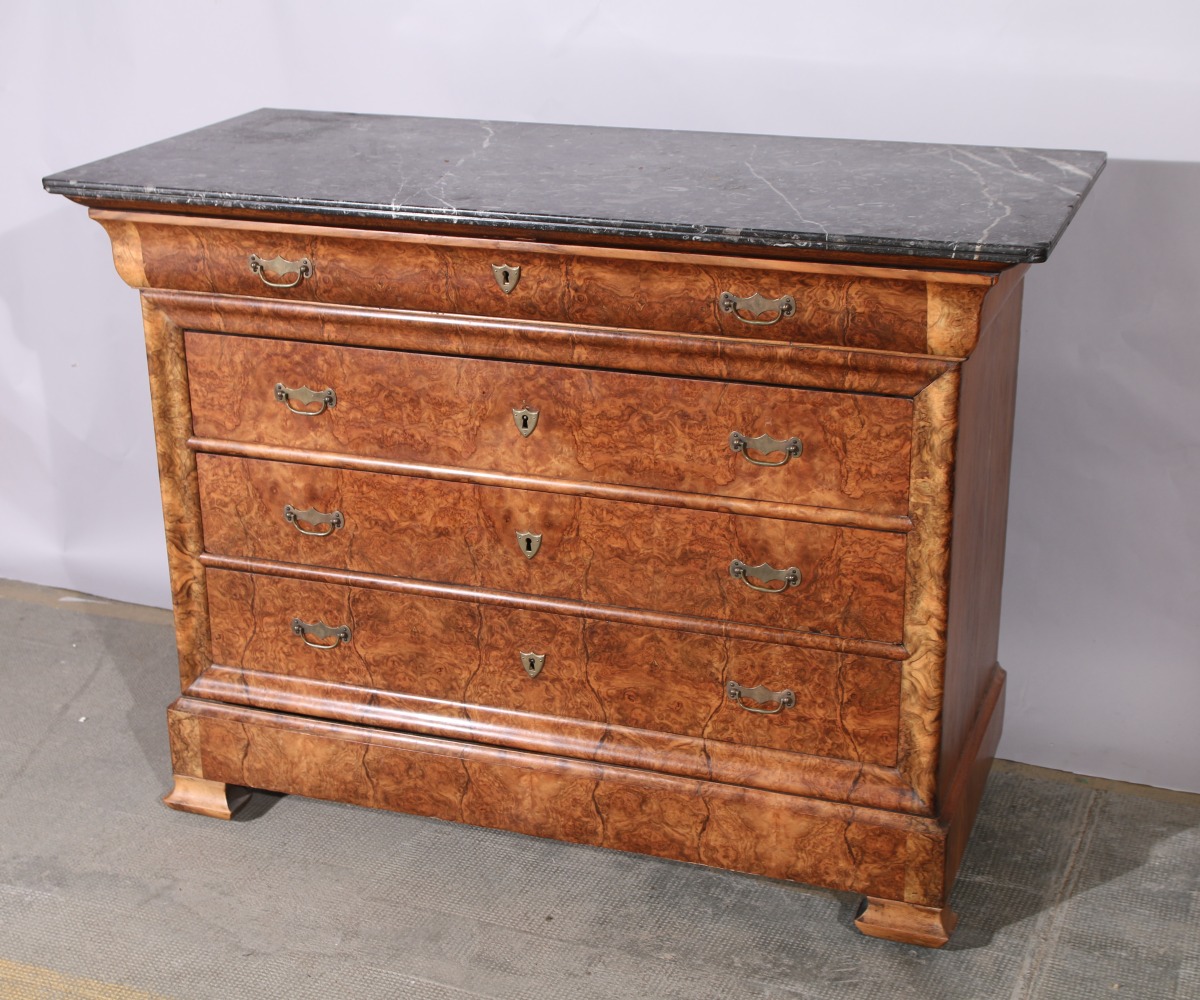 COMMODE de forme rectangulaire en placage de ronce de noyer. Elle ouvre à cinq tiroirs en façade. Dessus de marbre gris veiné blanc.