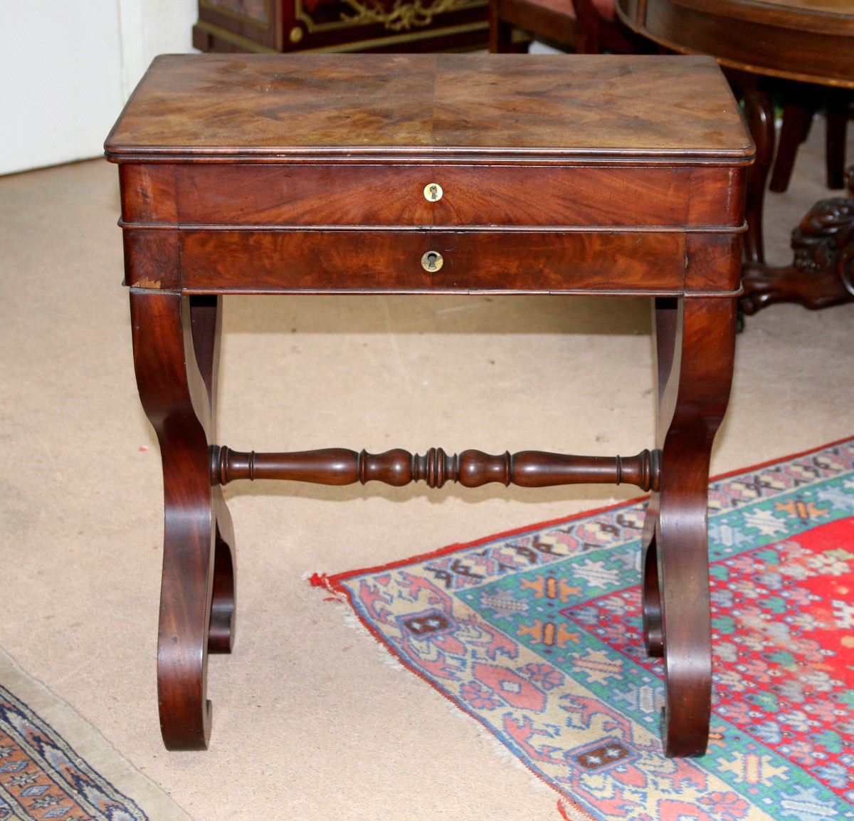 TABLE À OUVRAGE en acajou et placage d'acajou. Piètement en X réuni par une entretoise tournée. Elle ouvre à un abattant et un tiroir en façade.