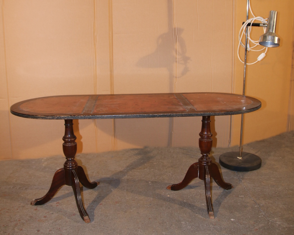 - TABLE BASSE de forme oblongue en bois de placage. Plateau gainé de cuirs. Travail anglais du XXe. Haut. 51, Long. 120 cm.