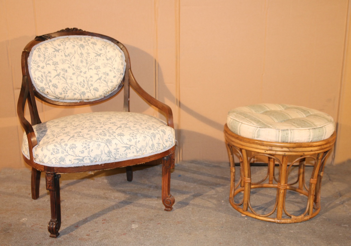 - 4 SIÈGES : FAUTEUIL à large assise en bois naturel de style Louis XVI; CHAISE rustique, REPOSE-PIEDS; POUF en rotin.