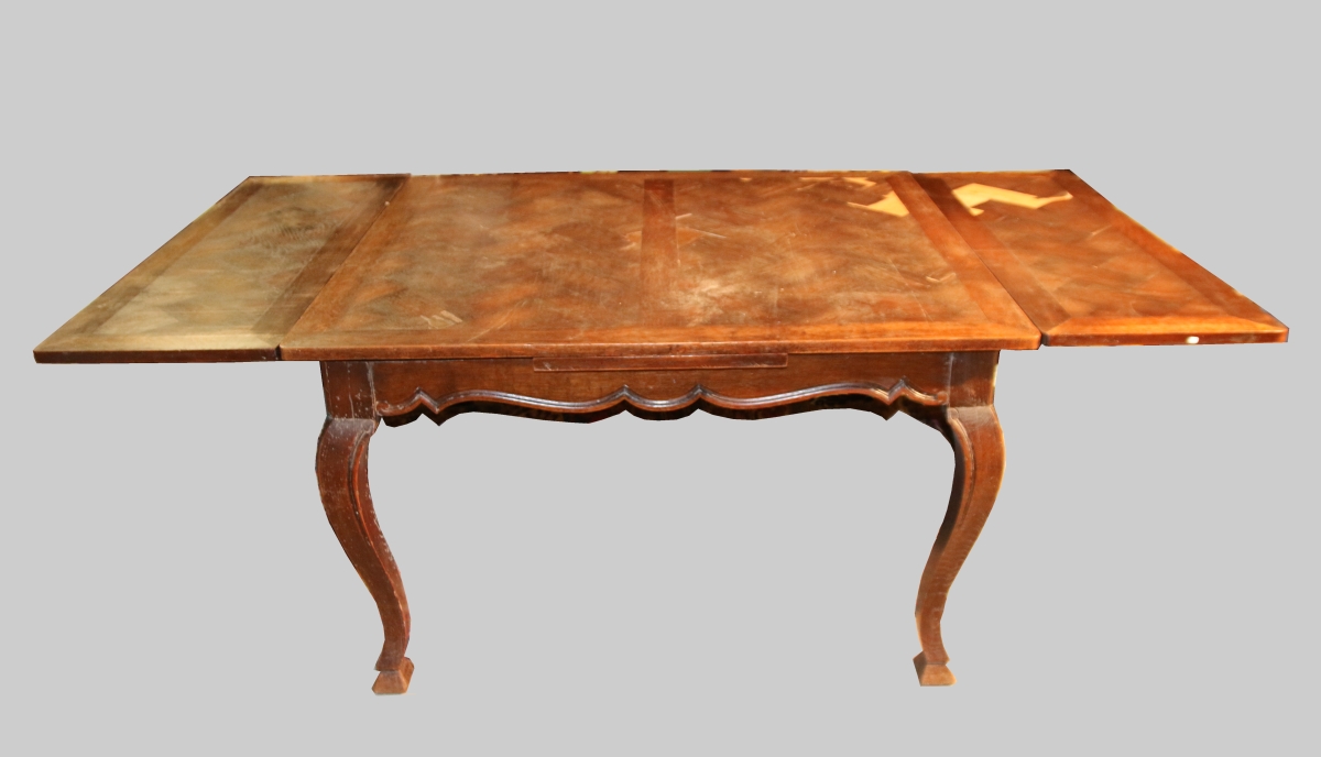 - TABLE DE SALLE-À-MANGER en bois de placage à deux allonges. Repose sur quatre pieds cambrés. Travail anglais du XXe. Long. 200, Larg. 105 cm.