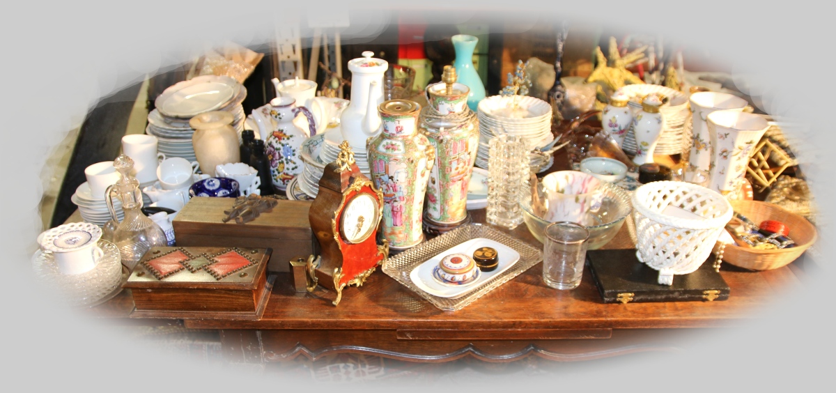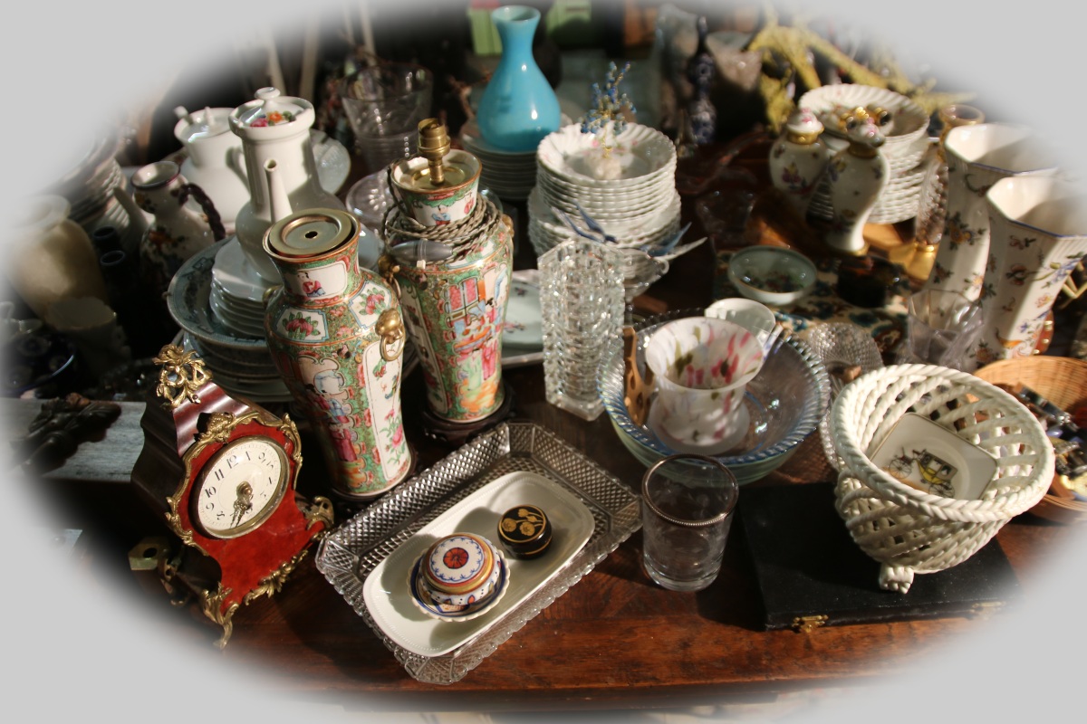 Importante RÉUNION DE BIBELOTS, verrerie (dont services de verres), céramiques, pièces encadrées... À découvrir.