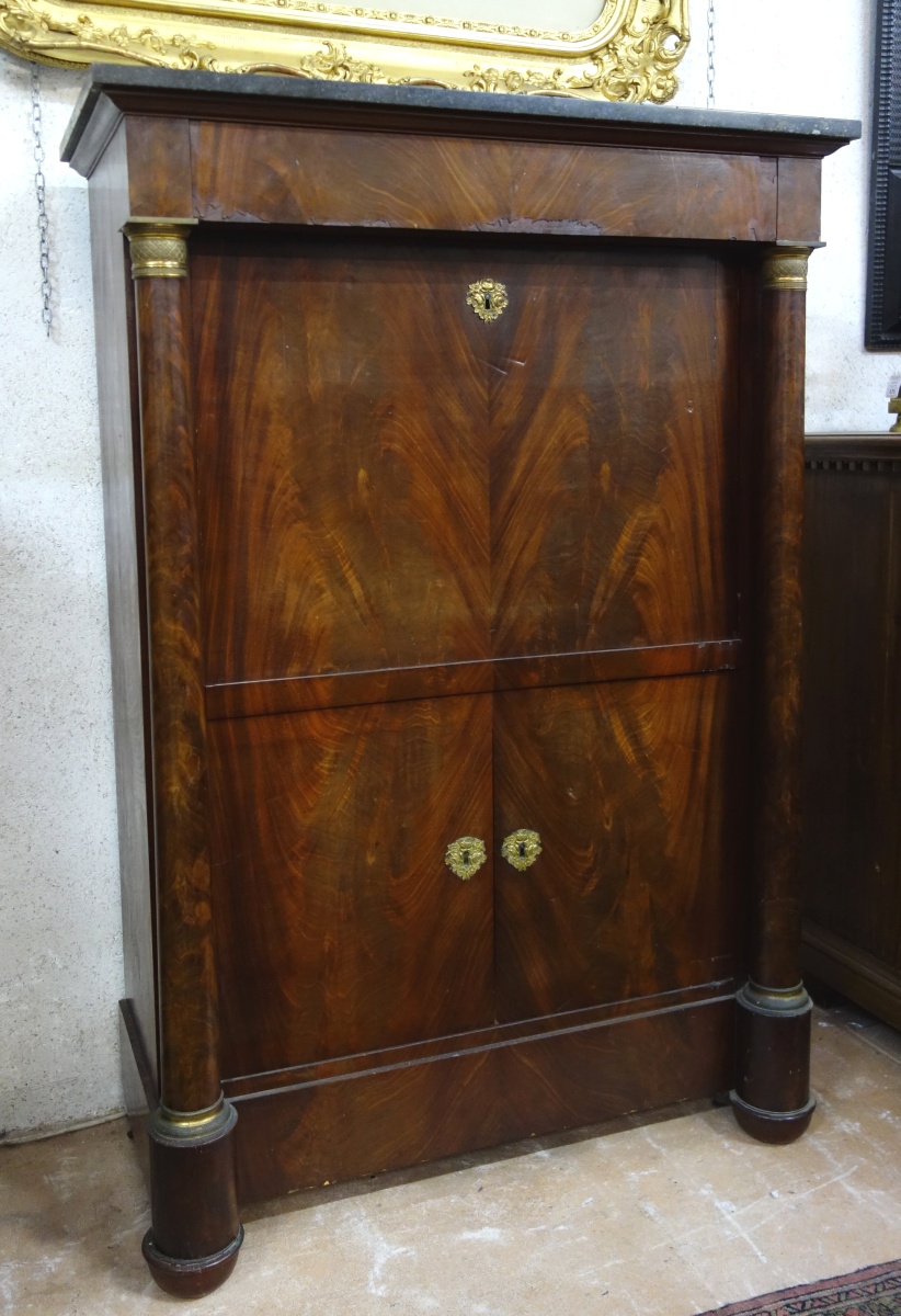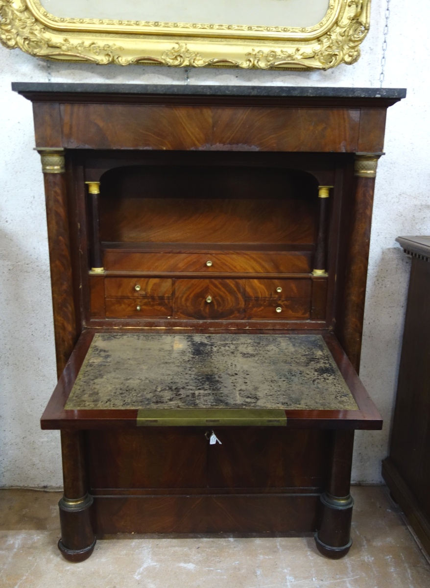 SECRÉTAIRE à abattant à colonnes détachées en acajou et placage d'acajou. Dessus de marbre noir.