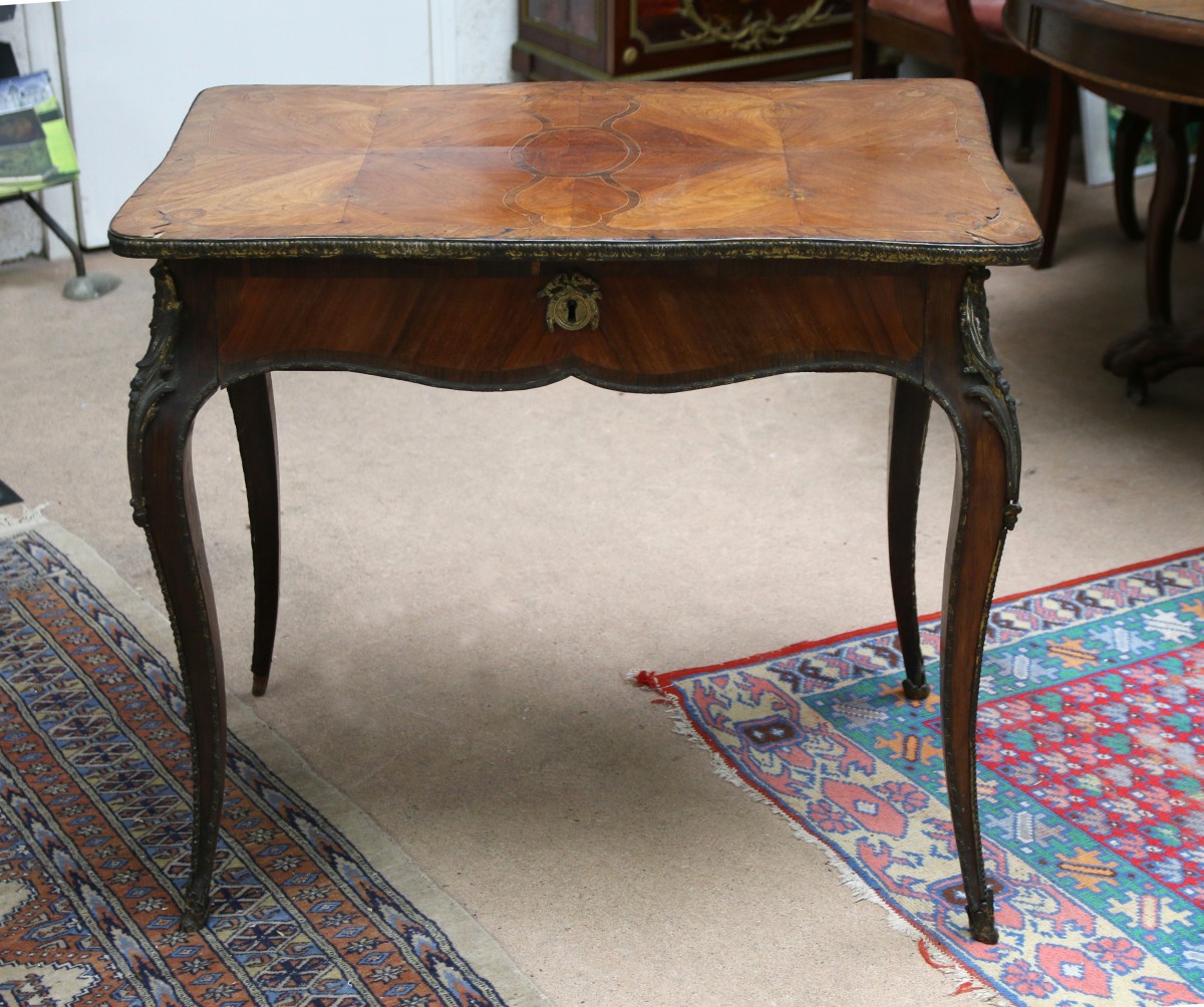 TABLE de milieu en placage de bois de rose et bois de violette ouvrant par un tiroir en ceinture. Plateau de forme rectangulaire légèrement chantourné orné d'un frisage en ailes de papillon ceint d'une frise de laiton doré. Elle repose sur quatre pieds cambrés ornés de chutes d'angle, filets et sabots en bronze.