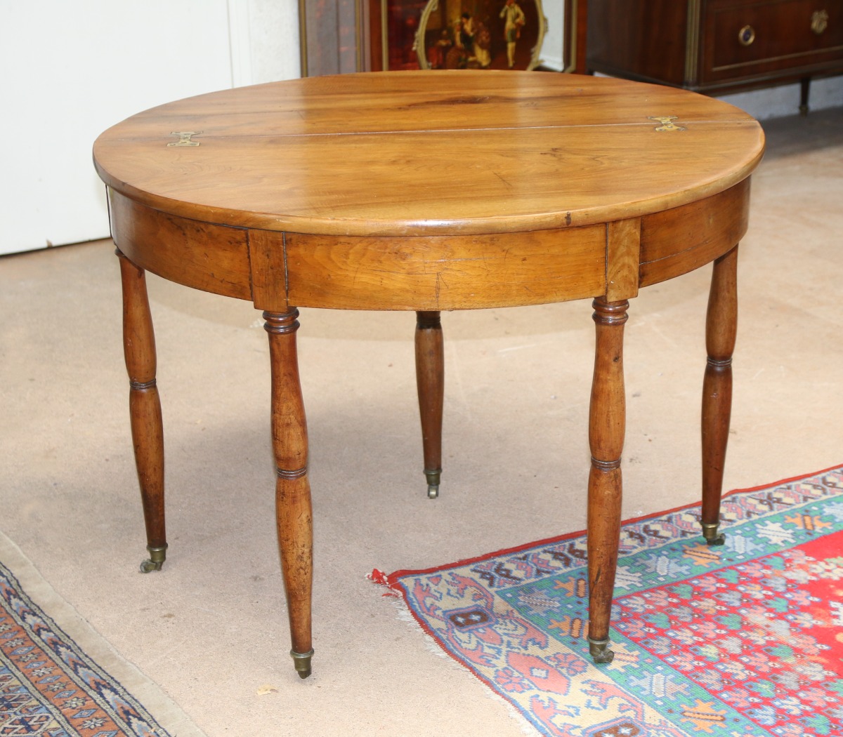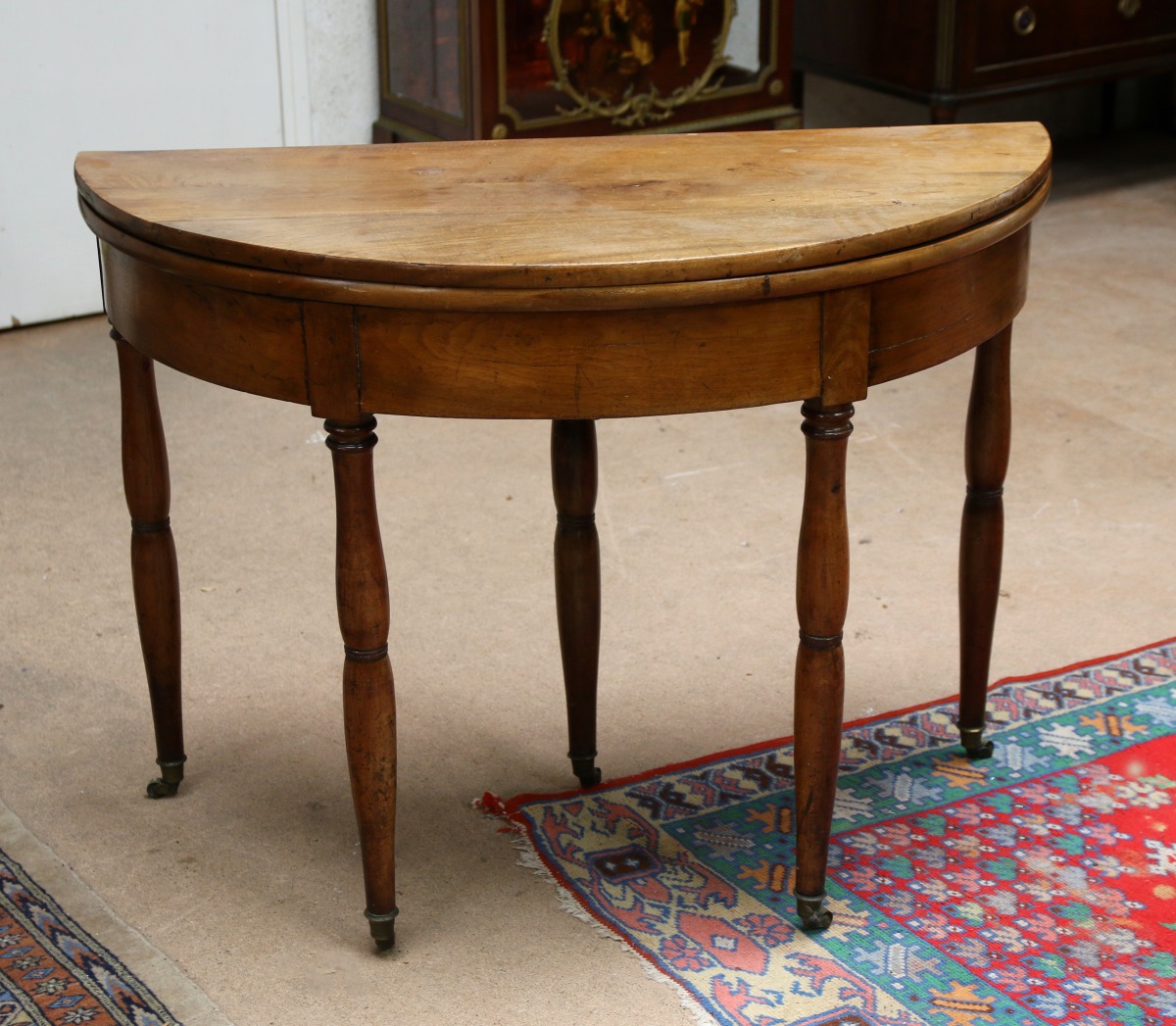CONSOLE DEMI-LUNE formant table ronde, en bois fruitier. Pied tourné en double balustre.
