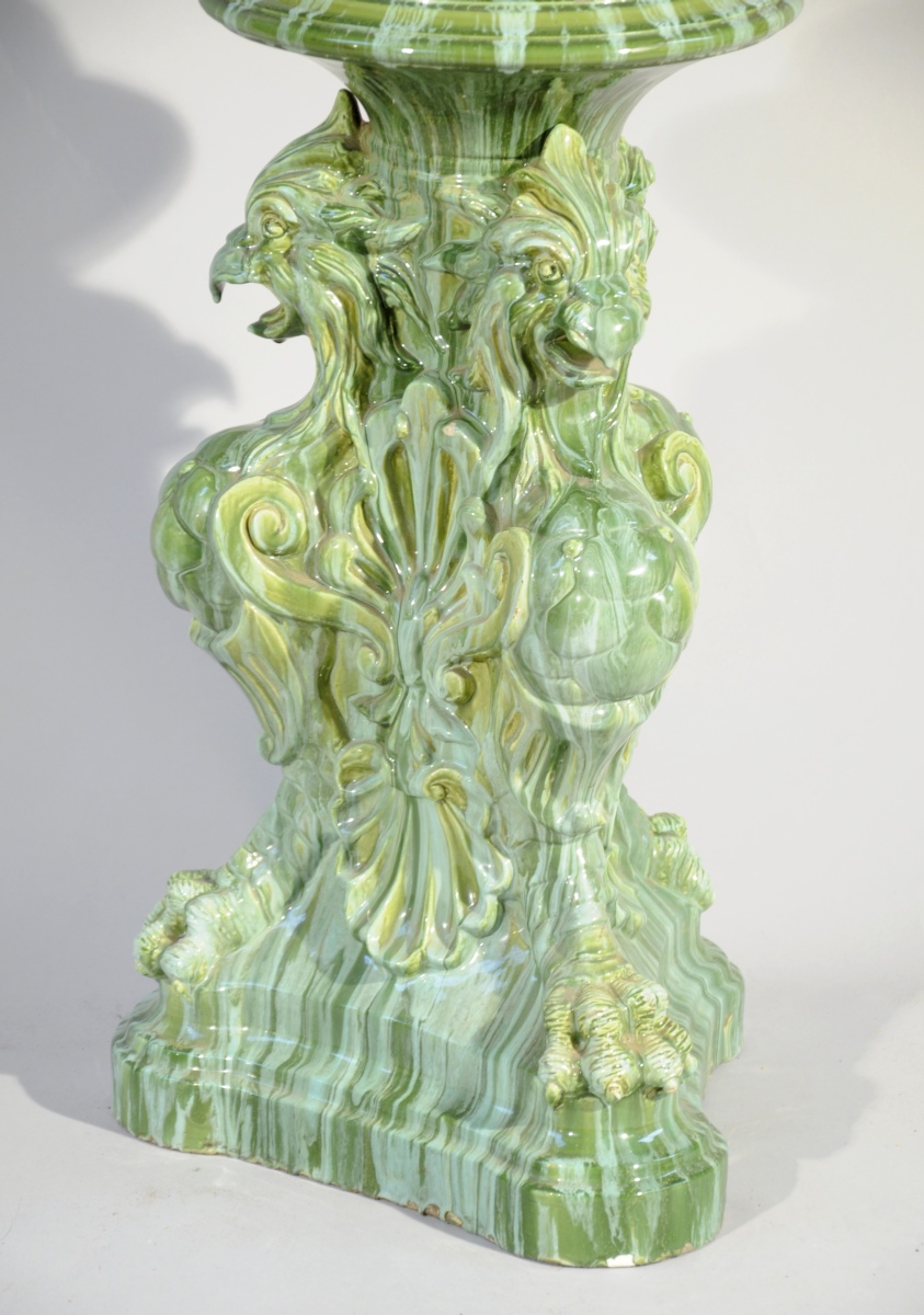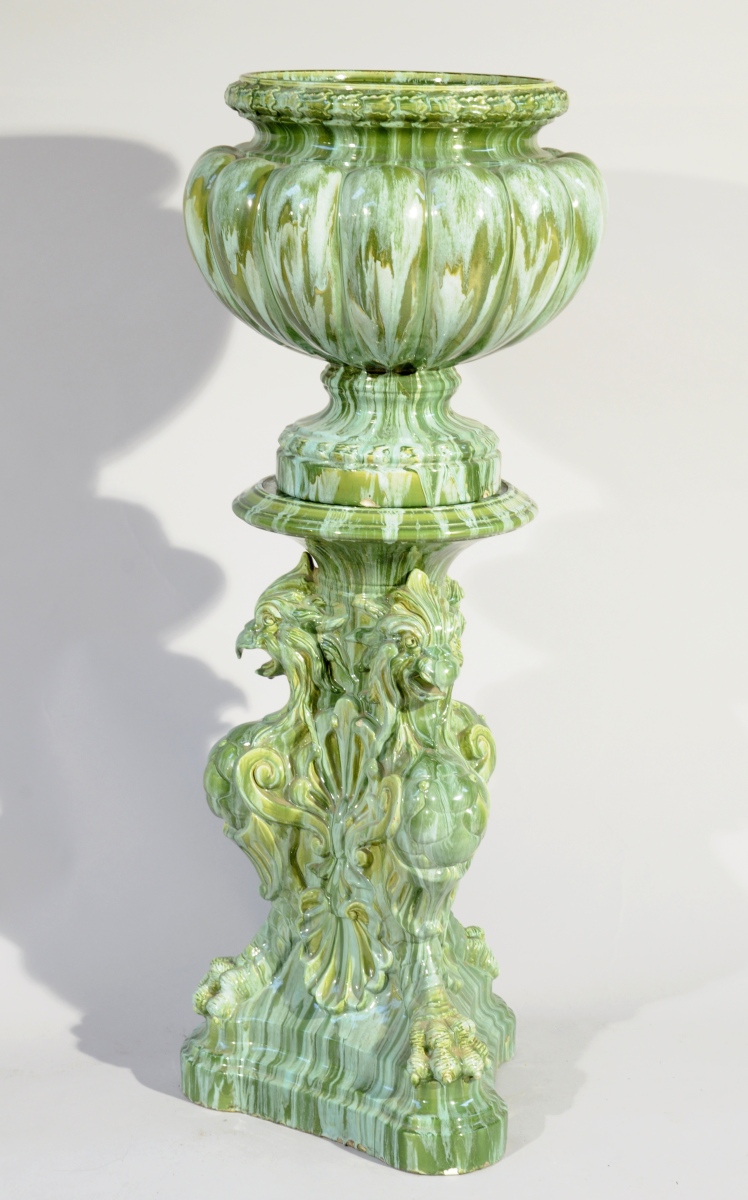 VASQUE sur PIÉDOUCHE à renflements à côtes ornée d'un tore de laurier - et sa STÈLE de forme rectangulaire à pieds de trois griffons. Céramique émaux camaïeux vert - flammés, non signée.