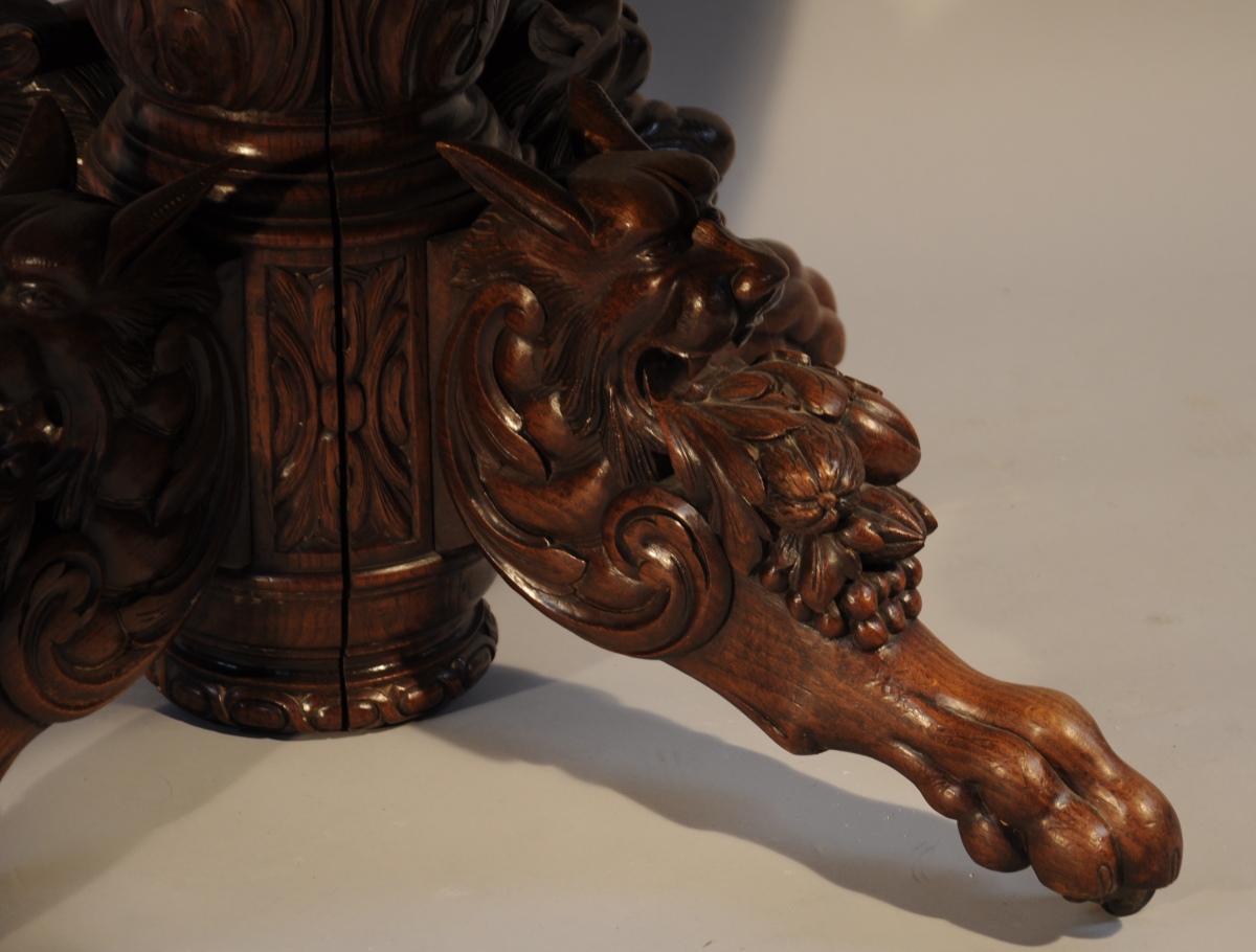 TABLE DE SALLE À MANGER de forme ovale en chêne teinté. Fût central mouluré et sculpté d'acanthes et de fleurons à quatre pieds richement ornés de têtes de fauve tenant des fruits dans leur gueule et terminés par des griffes. Reposent sur des roulettes. Déployée, la table présente quatre pieds d'appoint tournés sur roulettes.