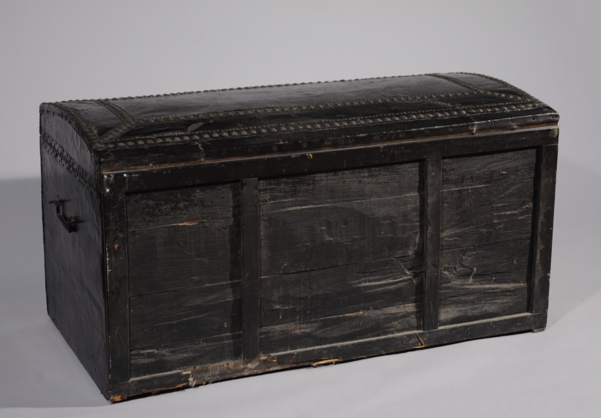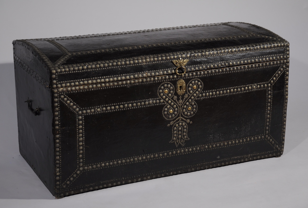 Grand COFFRE de forme rectangulaire à couvercle bombé gainé de cuir noir clouté de laiton. la face centrée d'un important motif floral stylisé encadrant l'entrée de serrure en bronze ornée de têtes de faunes. Un tête de séraphin à anneau mobile en bronze permet l'ouverture du couvercle. Poignées latérales.