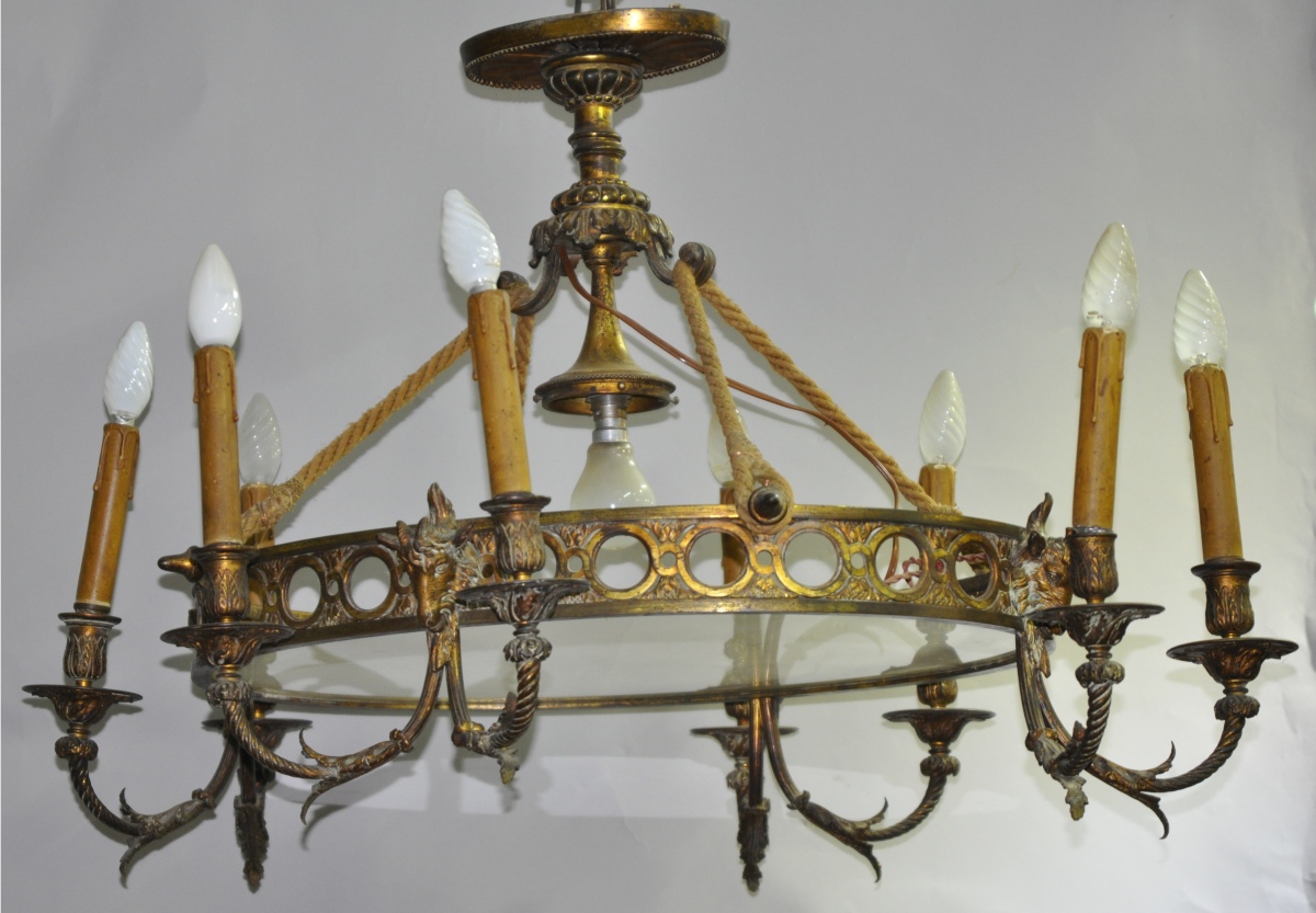 SUSPENSION de forme ovale à neuf lumières, en bronze ciselé et doré. La partie centrale foncée d'une plaque de verre sablé ceinte d'une galerie ajourée d'une frise d'oves. Cette dernière est agrémentée de quatre têtes de bélier retenant chacune deux bras de lumière torses ornés d'acanthes stylisées.