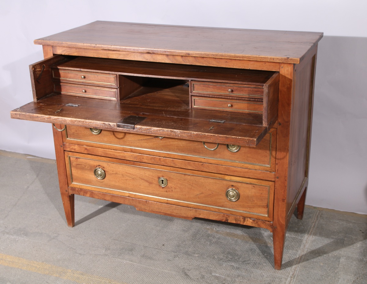 COMMODE-SECRÉTAIRE de forme rectangulaire en noyer ouvrant en façade par deux tiroirs. Un tiroir simulé en partie supérieure se rabat pour découvrir un pupitre agrémenté de quatre tiroirs et une niche. Ornementation de filets de laiton. Anneaux de tirage et entrées de serrures en bronze rapportés. Elle repose sur quatre pieds gaine.
