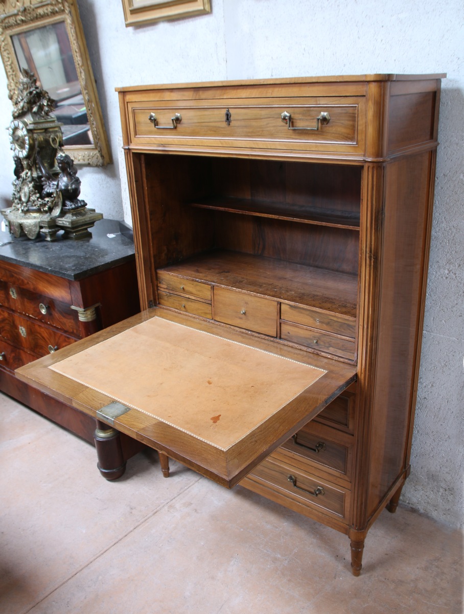 SECRÉTAIRE DROIT en noyer et placage de noyer. Il ouvre par un tiroir et un abattant en partie supérieure et trois tiroirs en partie inférieure. L'abattant foncé de cuir découvre un compartiment et cinq tiroirs sur deux rangs. Montants cannelés. Piètement quadripode. Garniture de bronzes tels qu'entrées de serrures et poignées mobiles.