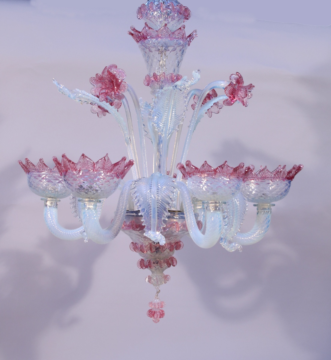LUSTRE à six bras de lumières en verre de Venise couleur opaline savonneuse et rose. Les bobèches adoptant la forme de tournesols alternent avec des ornements feuillagés. Les ornements supérieurs figurent jonquilles et feuilles.