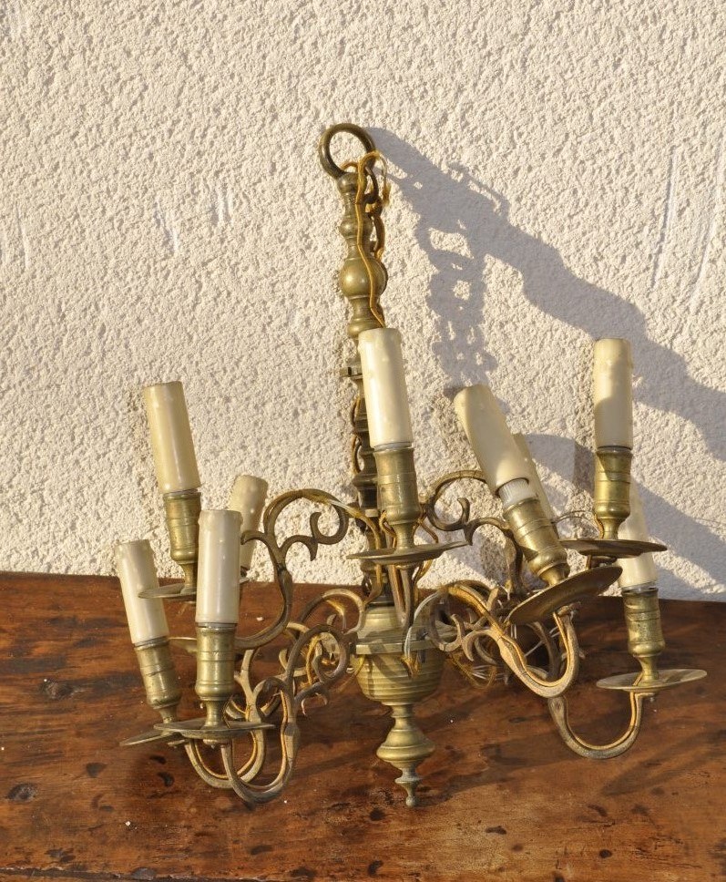 - LUSTRE à neuf bras de lumière de forme mouvementée sur deux registres: six sur le registre inférieur et trois sur le supérieur. Fût central tourné en balustre et terminé par une toupie.