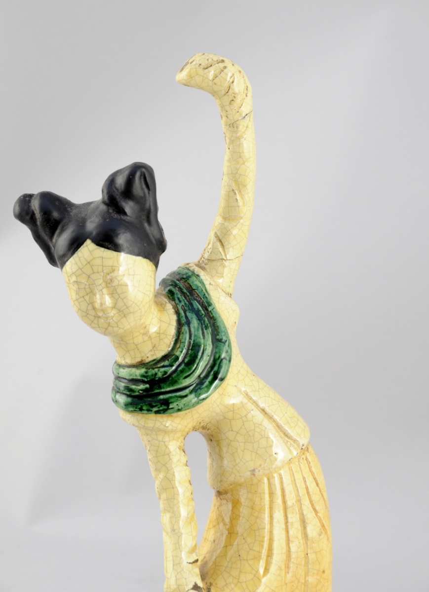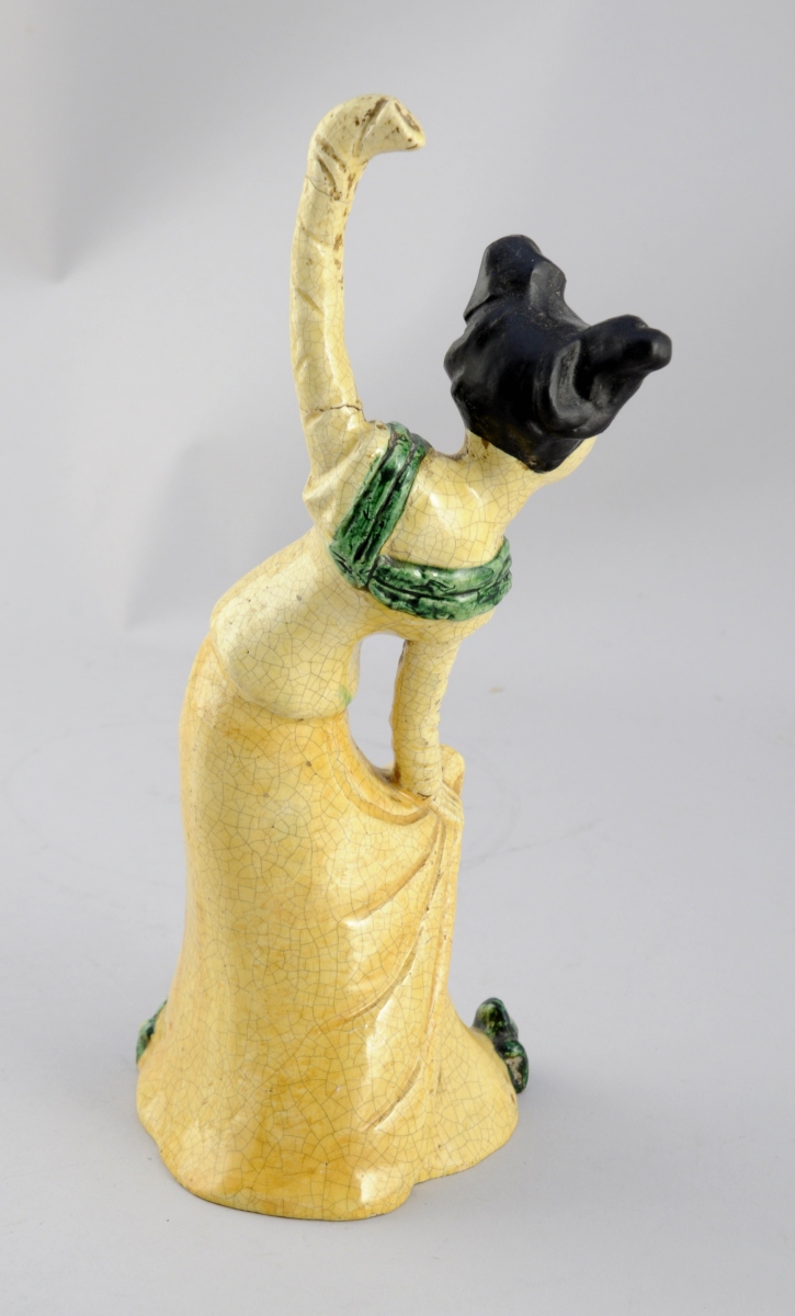 DANSEUSE en grès (?) émaillé jaune craquelé, vert et noir.