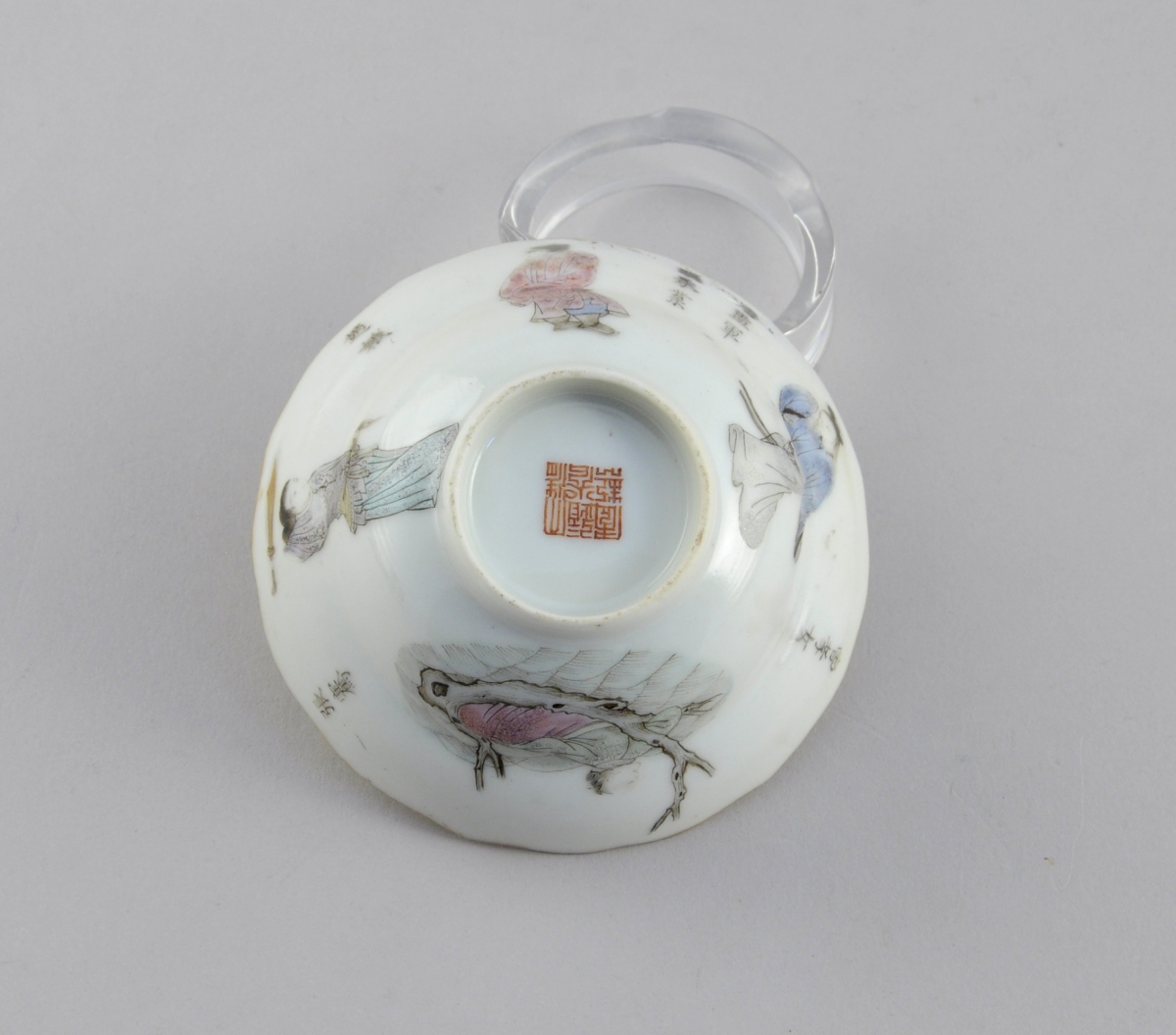 JOINT : Petit BOL en porcelaine à bords chantournés. Décor polychrome de personnages et idéogrammes. Filet or sur le col. Cachets. Haut. 4, Diam. 9,5 cm.