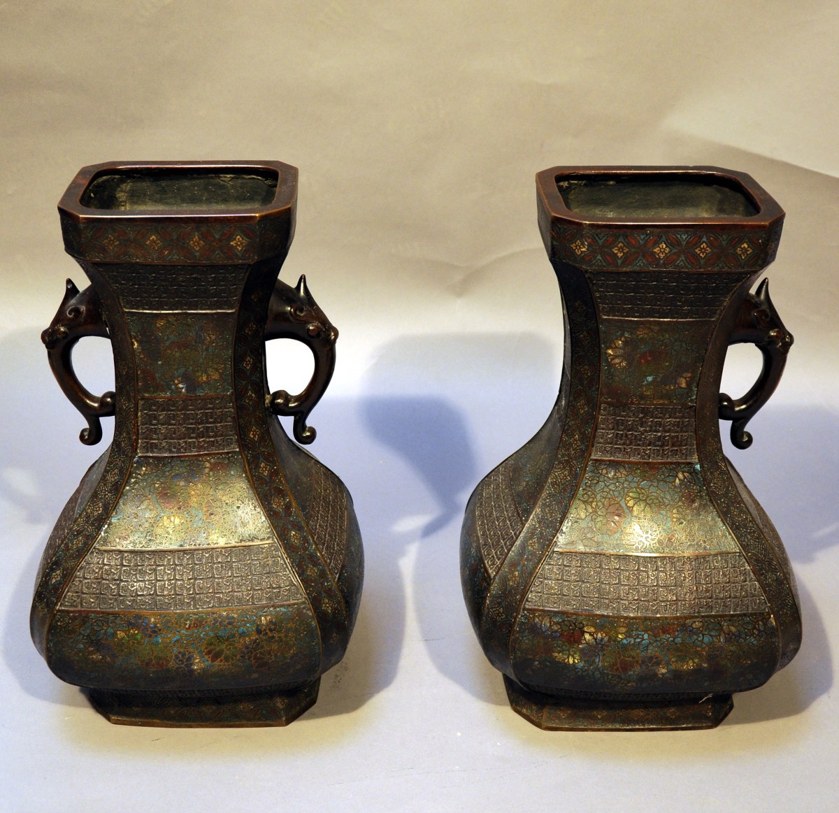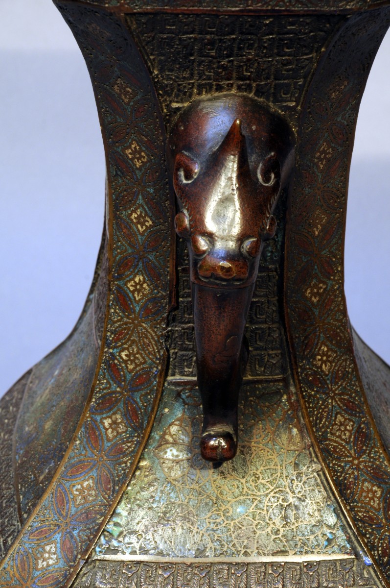 JAPON. Paire de VASES balustre en bronze à décor de motifs floraux et géométriques en émaux cloisonnés. Anses à têtes d'éléphants. Signature.