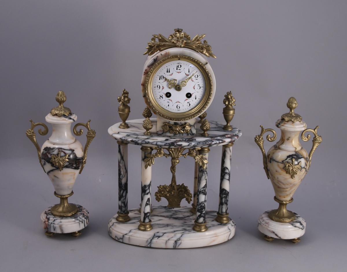 GARNITURE DE CHEMINÉE en marbre et bronzes redorés (peinture). Elle se compose d'une pendule portique reposant sur six colonnes et de deux vases balustre.