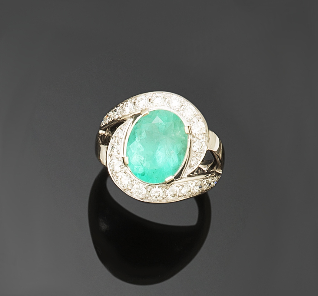 BAGUE TOURBILLON en or blanc, sertie au centre d'une ÉMERAUDE (probablement Colombienne) taille ovale d'environ 3,49 carats, agrémenté de 22 DIAMANTS blancs taille moderne d'environ 0,90 carat.
