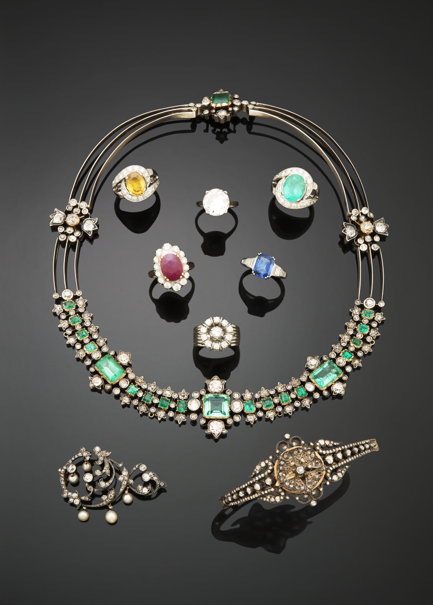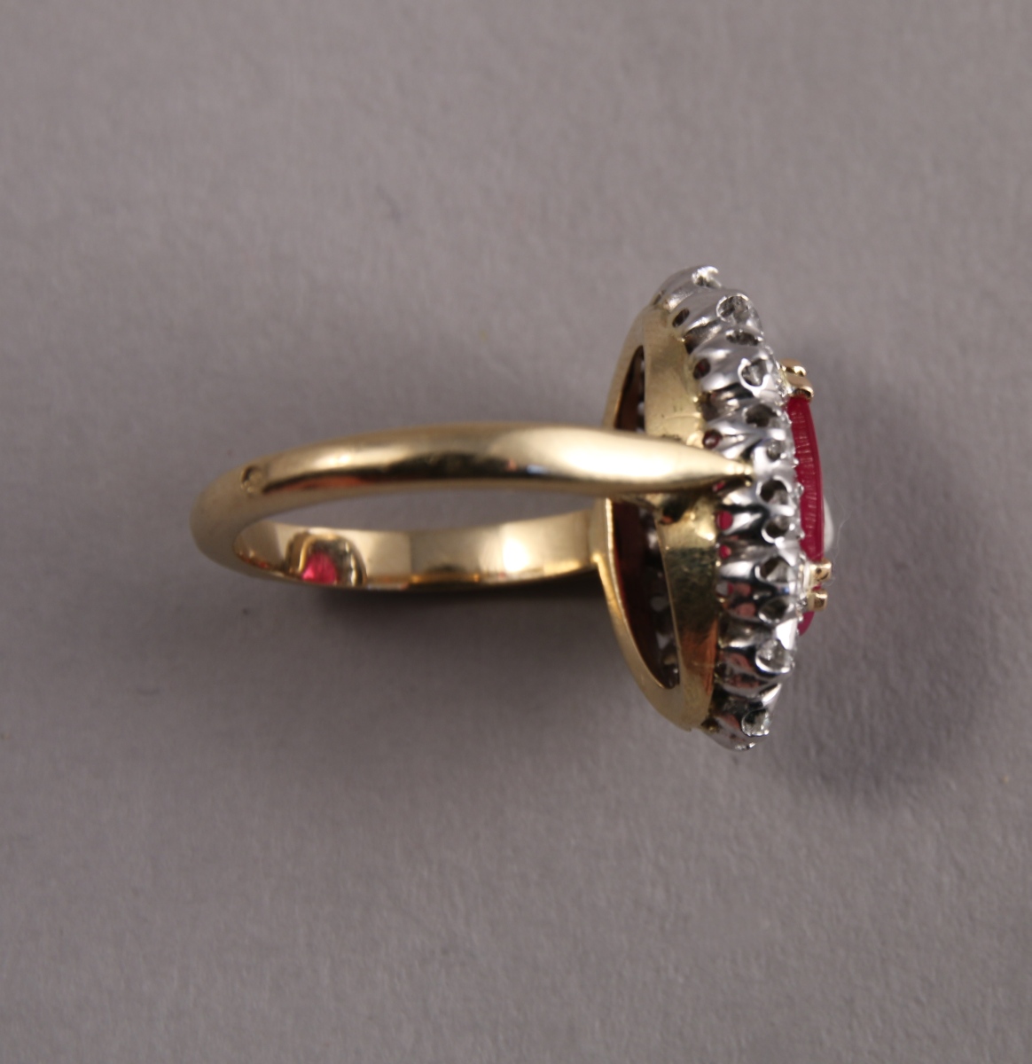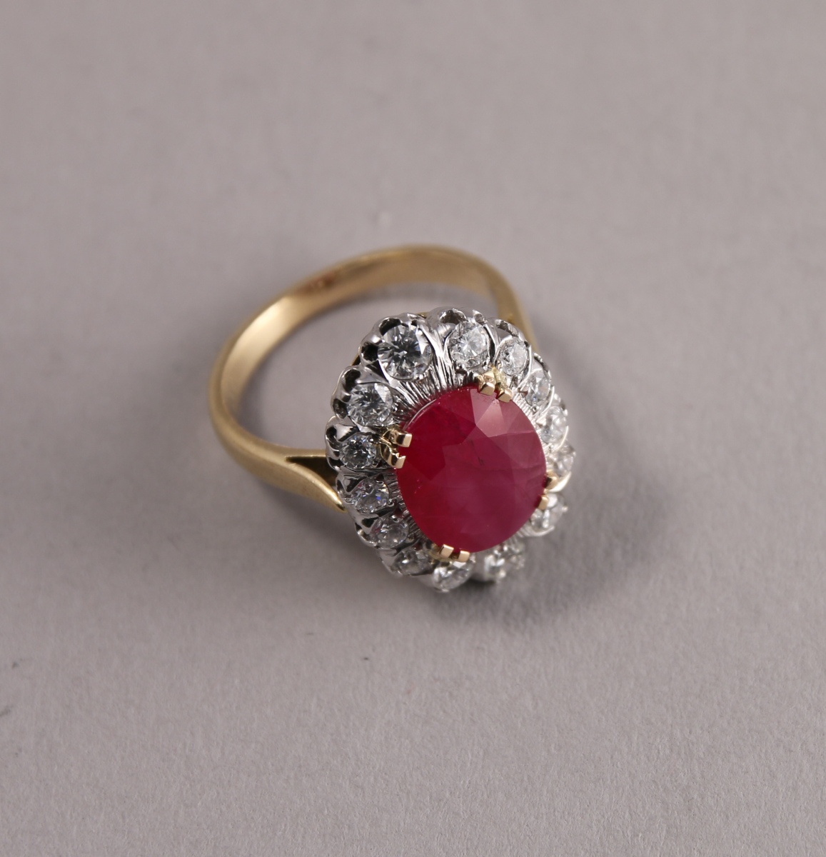 BAGUE POMPADOUR en or de deux tons, ornée en son centre d'un RUBIS (probablement Birman) taille ovale de 3,65 carats environ, entouré de quatorze DIAMANTS blancs taille moderne d'environ 0,95 carat.