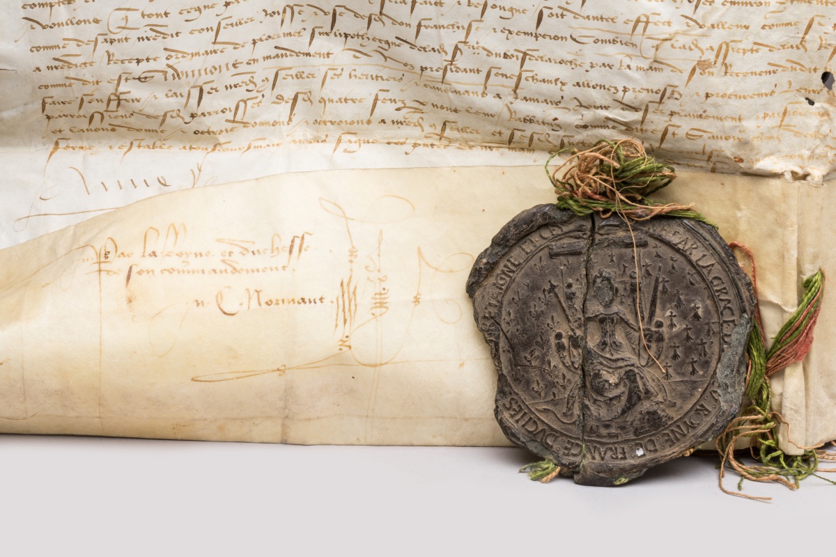 L'EXCEPTIONNEL GRAND SCEAU DE CIRE NOIRE (deuil de Charles VIII) est à l'effigie d'Anne de Bretagne trônant en majesté sur fond d'hermines, avec la légende courant sur le bord circulaire ANNE PAR LA GRACE DE [DIE]U ROYNE DE FRANCE DUCHES[SE DE B]RETAIGNE ETC. ; au contrescel, ses armes supportées par deux lions et sommées de la couronne, le tout entouré de la cordelière.
