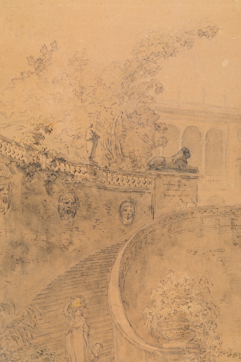 Hubert ROBERT. Lavandières near the fountain of Caprarola gardens. Brown ink. Signed and dated "H Roberti delieavit Roma 1760" lower.