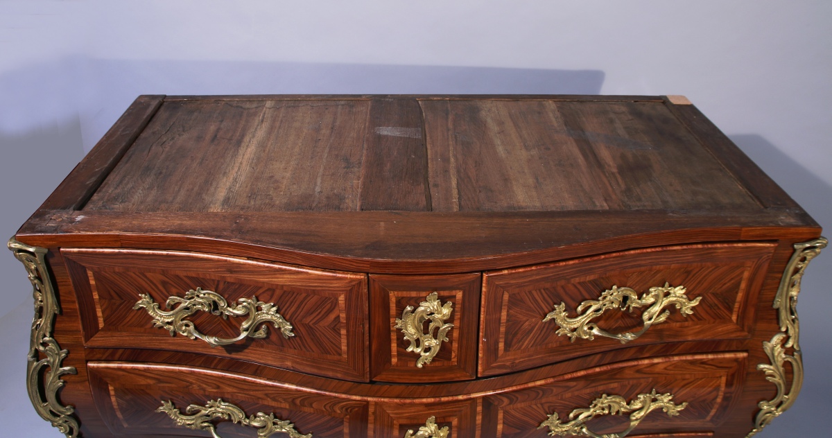 en bois de placage de violette en frise ouvrant à cinq tiroirs sur trois rangs. Ornementation de bronzes dorés tels qu'entrées de serrure, poignées de tirage, chutes, cul-de-lampe et sabots de style rocaille.