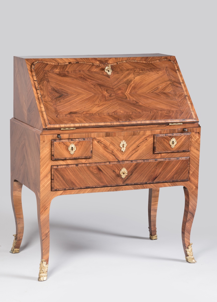 en placage d'amarante toutes faces, à décor de frisage en ailes de papillon. Il ouvre en façade par trois tiroirs et un abattant découvrant un intérieur compartimenté de casiers, de six tiroirs et d'un coffre à coulisse secret. Entrées de serrure en bronze doré. Il repose sur quatre pieds cambrés terminés par des sabots d'ongulé feuillagés en bronze ciselé et doré.