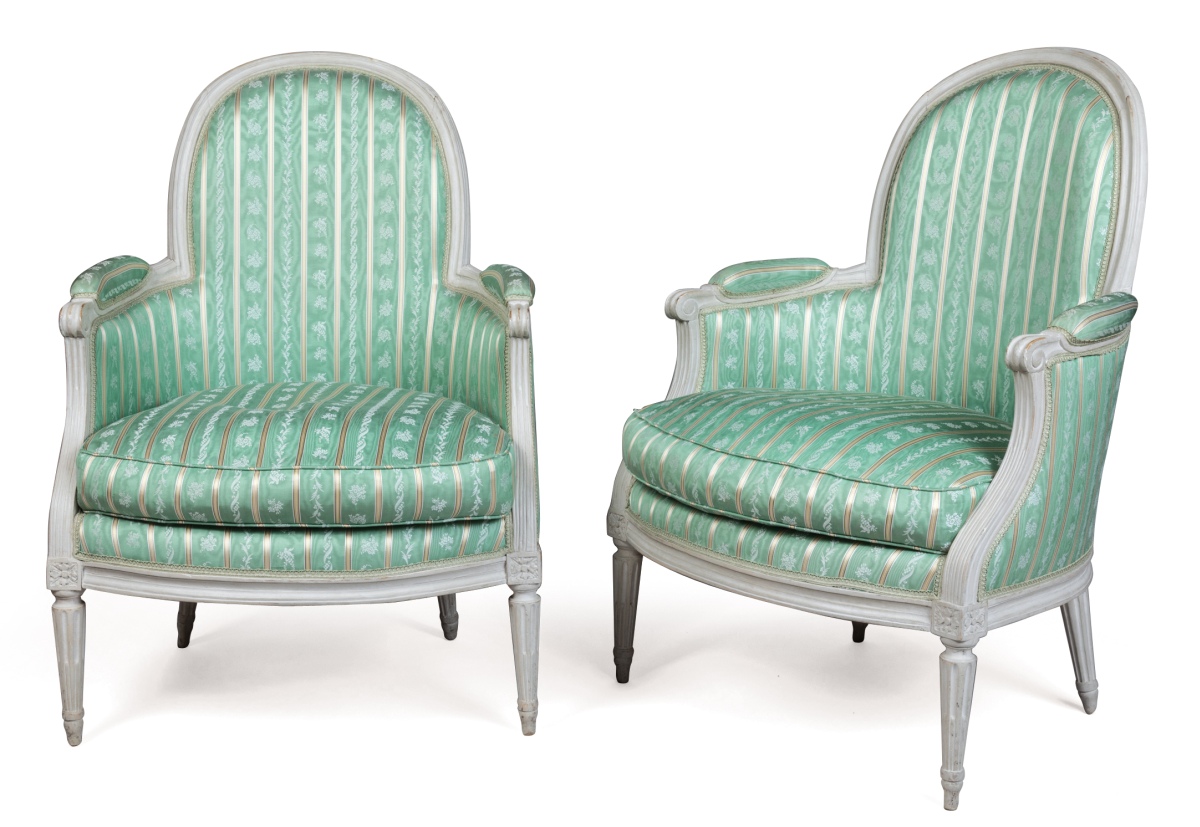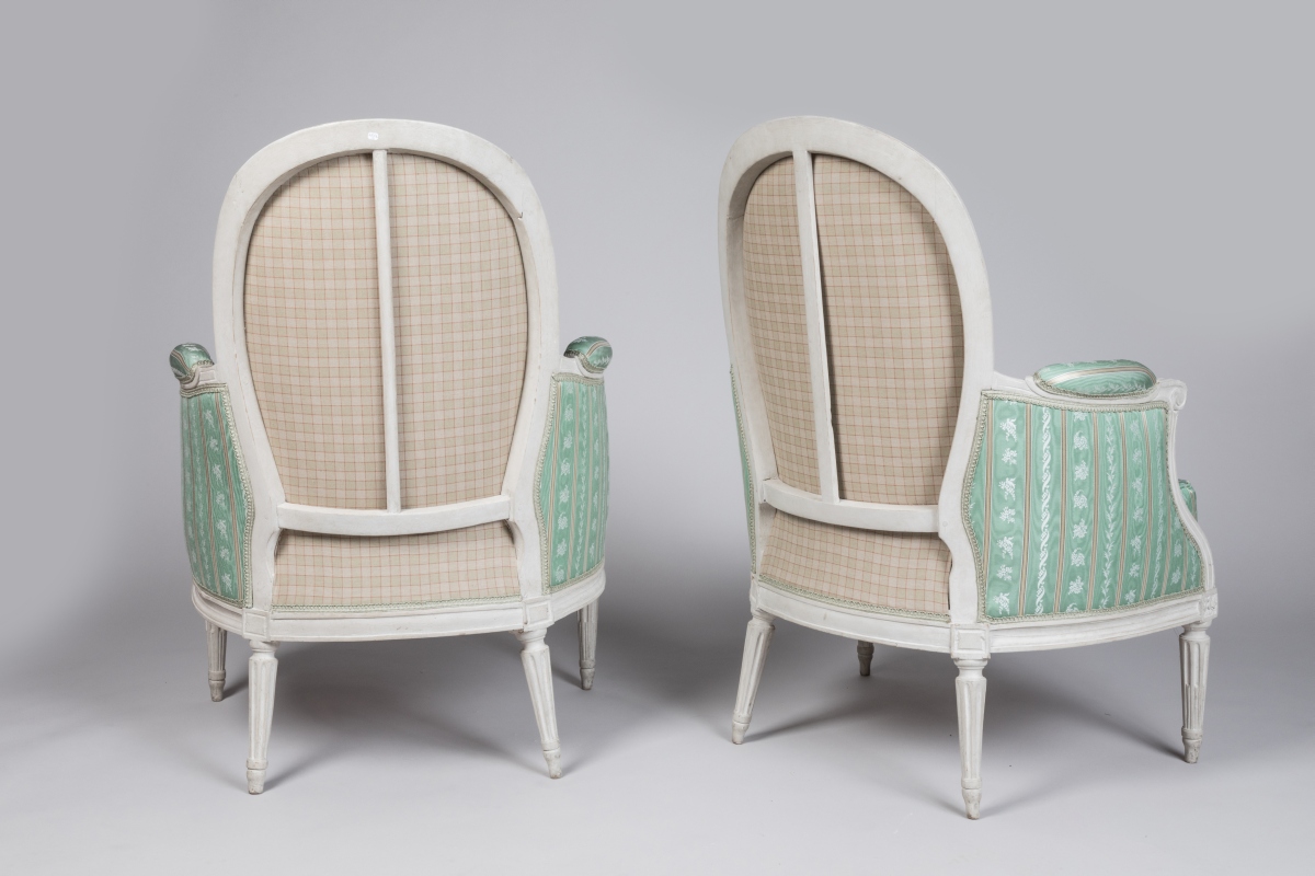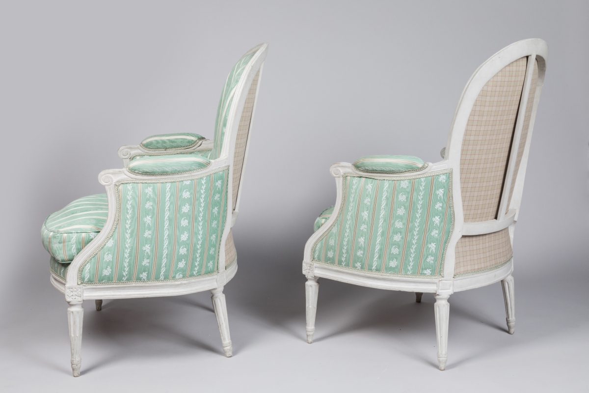 A pair of Louis 16 grey painted BERGERES in CABRIOLET.