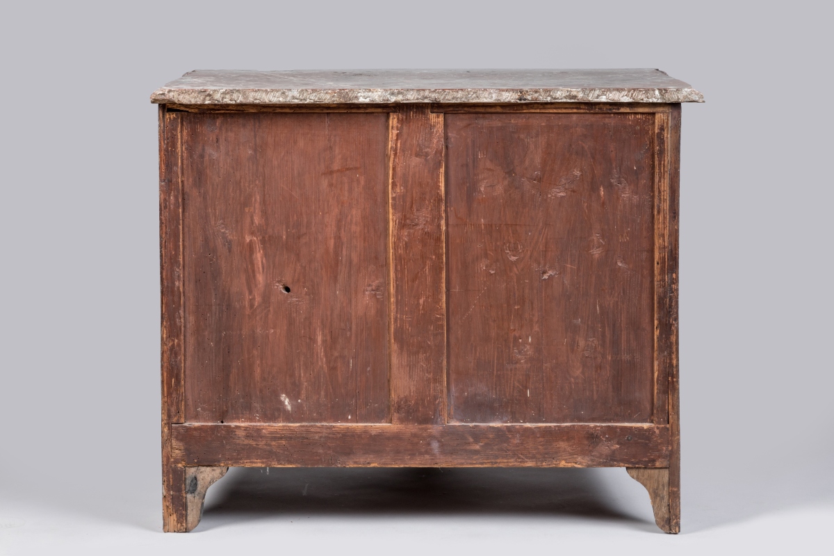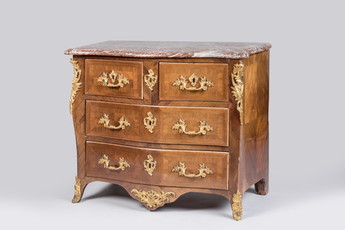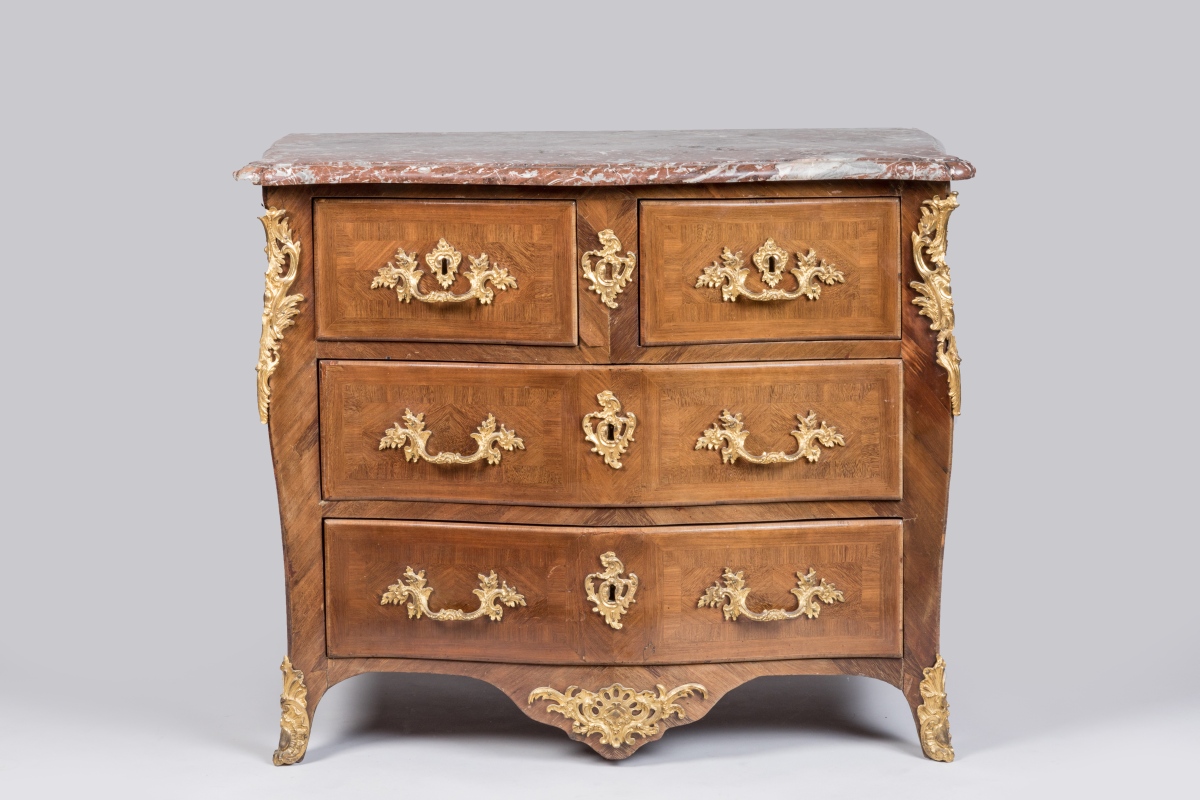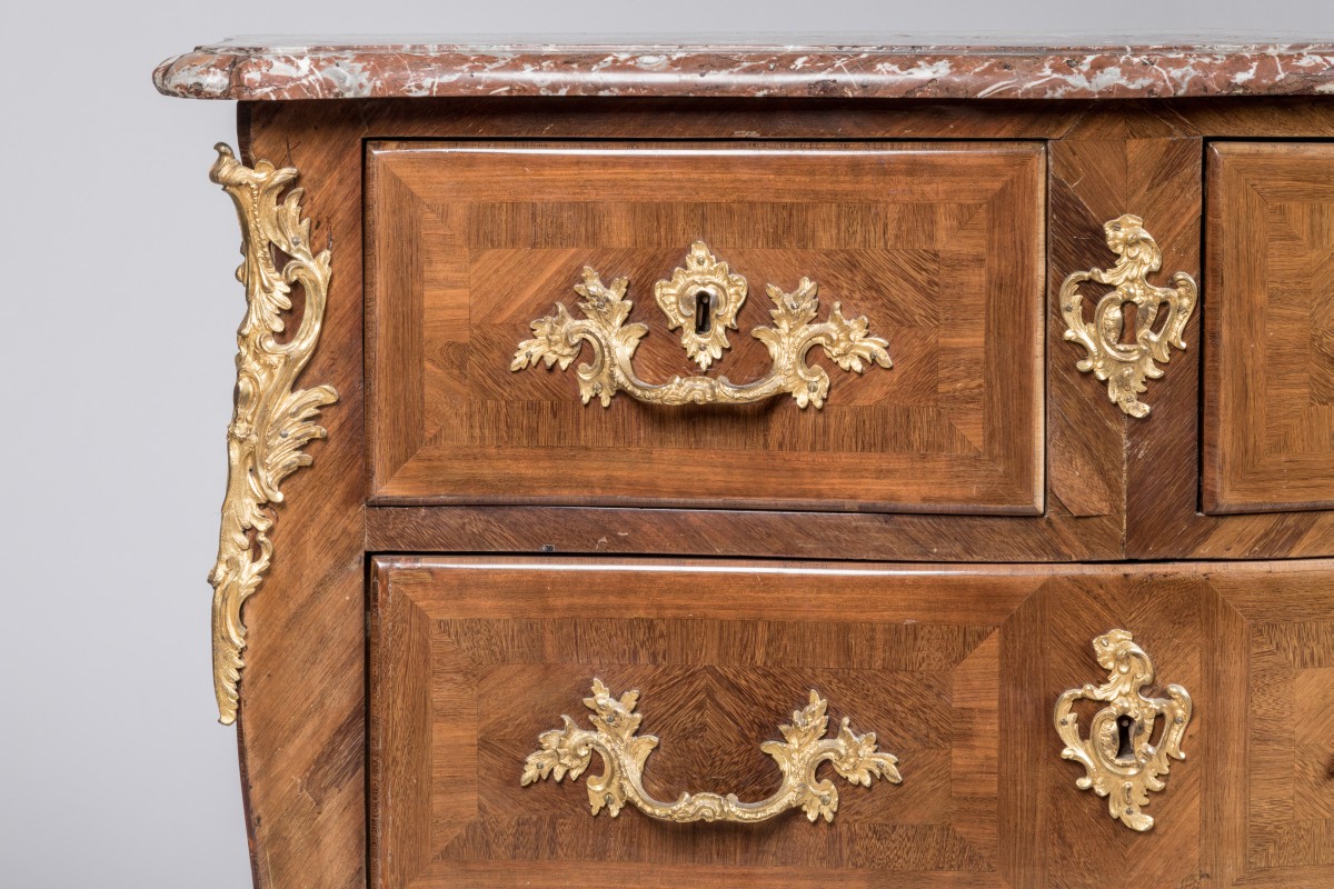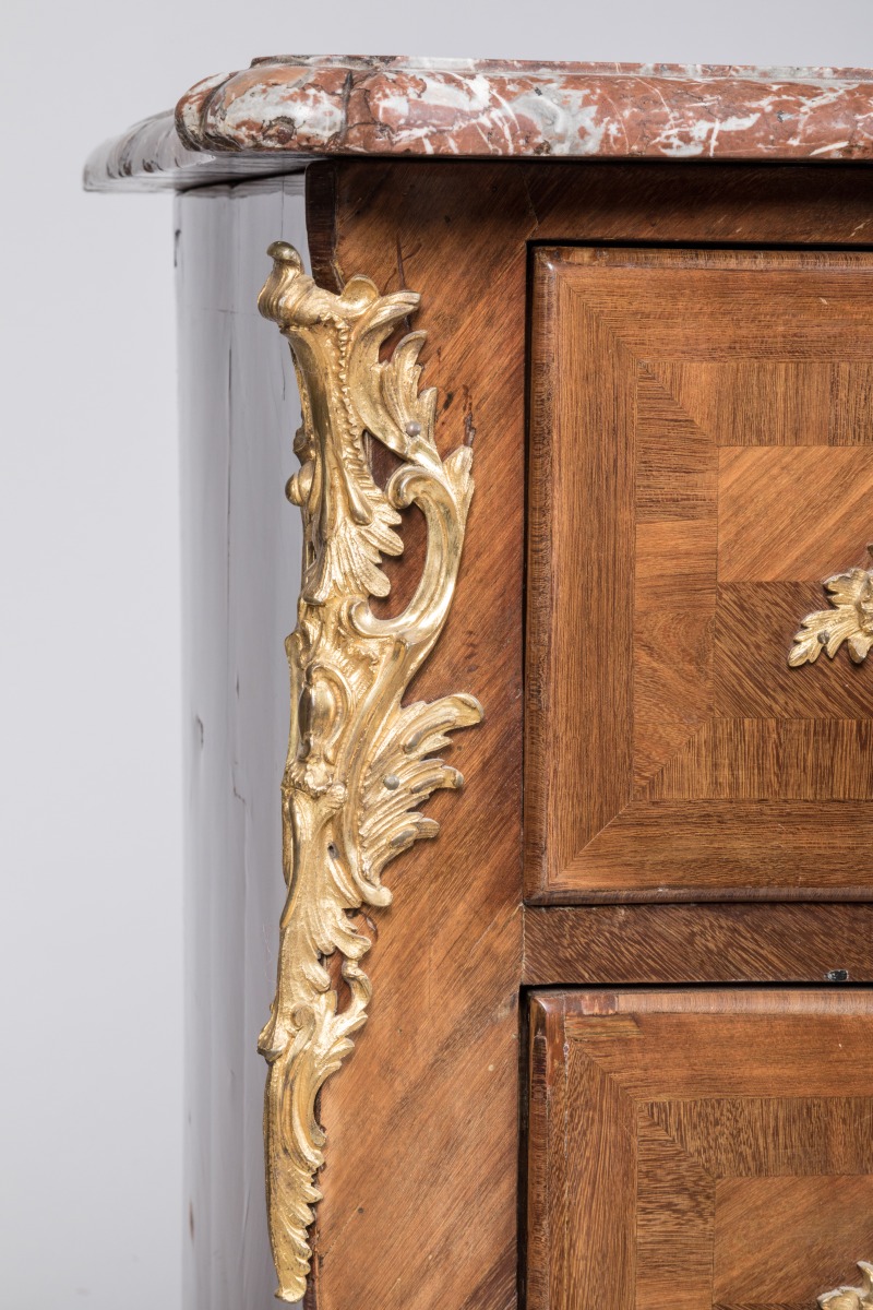 en bois de placage marqueté à décor de frisages géométriques. Elle ouvre par quatre tiroirs sur trois rangs, le premier en deux parties. Belle ornementation de bronzes dorés de style rocaille tels que chutes, entrées de serrure, poignées de tirages et cul-de-lampe. Elle repose sur quatre petits pieds cambrés. Dessus de marbre rouge royal.