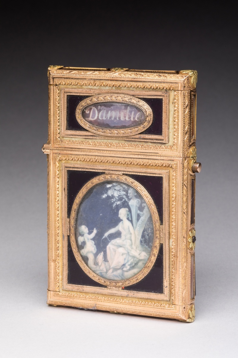 de forme rectangulaire en or de deux tons finement ciselé de frises feuillagées et appliqué de fleurons. Les plats à fond d'émail guilloché aubergine et encadrements d'ivoire sont ornés d'un médaillon peint à l'imitation d'un camée coquille figurant une allégorie de la fidélité. En partie haute un médaillon de forme ovale porte les mentions peintes "Souvenir" d'un côté, et "D'amitié" de l'autre. Les côtés enchâssent des plaquettes de nacre. L'un des plats, en coulissant, révèle une miniature sur ivoire figurant un homme de qualité. Ouverture à charnière et bouton-poussoir découvrant un porte-mine en or et un carnet de trois feuilles d'ivoire.