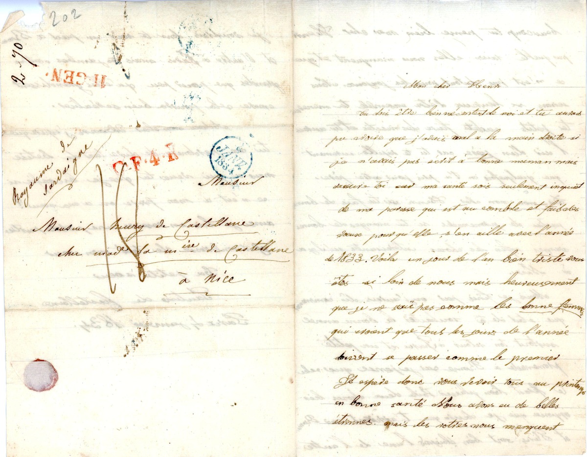 Joint : L.A.S. de Pauline de CASTELLANE (1823-1895), Paris, 4 janvier 1834, adressée à son frère Henri de Castellane en villégiature à Nice ; lettre d'une fillette de 10 ans souhaitant les vœux pour la nouvelle année : "(…) Voilà un jour de l'an bien triste vous êtes si loin de nous (…) nous avons eu de belles étrennes, mais les votres nous manquent beaucoup, tu penses bien mon cher Henri par quelle raison elles nous manquent et que ce n'est pas du tout pour les joujoux, nous serions si heureux d'être ensemble, tu mènerais tes petits cadets faire des visites et tu aurais l'air d'un père car tu te rappelles surement que quelquefois on t'a pris pour notre père…"