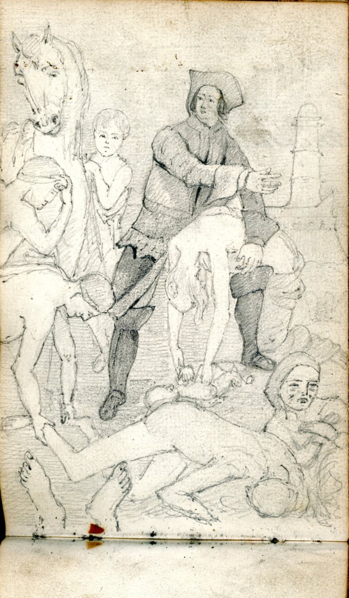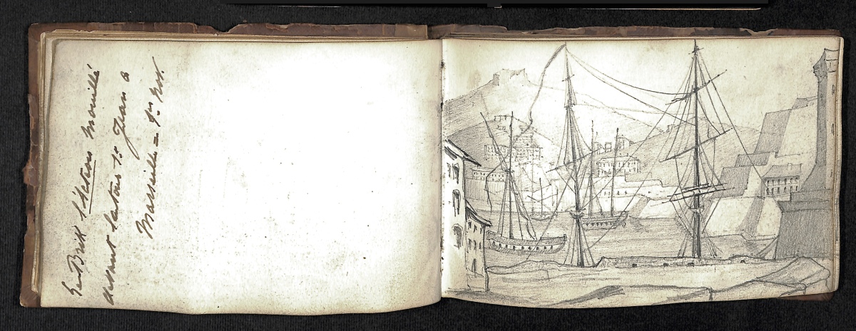 À Neuvy-sur-Loire le 28 septembre 1833 - La poste de Châtel de Neuvre le 29 septembre 1833 - A Saint Pourçain [sur Sioule] 29 sept. - Sur la terrasse du château de Barante 7 octobre 1833 [commune de Dorat] - Crête de rochers sur une montagne au-dessus de Barante 8 octobre 1833 - Vue sur les montagnes d'Ambert, dans le chemin de Barante au Moutier 13 octob. - Roches de Thiers 14 octobre - Vue d'une partie de la ville de Thiers et du Mont-Dore prise du Cordon 14 oct. - La chaîne des Dômes prise plus haut sur le cordon 14 octobre - Autre partie de la chaîne des Dômes prise au point le plus élevé du Cordon 14 oct. - Petit château en face de Valence 20 octobre 1833 - En face de Montélimart 20 octobre - Viviers, vu du Rhône 20 octobre - Le Chevalier Rose [Roze] nommant aux galériens l'exemple de relever les morts pendant la peste de Marseille, d'après un tableau de Paulin Guérin à la santé de Marseille octobre 1833 - A Notre de la Garde - le brick " l'Action " mouillé devant la tour Saint Jean à Marseille 1er nov. - Notre de la Garde, vue à travers la mature du brick à Marseille 1er nov. 1833 - La rade de Toulon et le fort Lamalgue 3 novembre 1833 - Mer de Fréjus, vue de la forêt de Lestrelles [Esterel] 3 novembre 1833 - Dessiné dans une promenade à cheval, devant le monastère qui ferme la vallée du Paillon 12 nov. - Dessiné sur la terrasse d'une maison de campagne au-dessus de Nice 16 nov. - Dans la montée qui conduit à Villefranche 22 nov. - Vue sur un coin des roches de Nice, prise d'un petit promontoire avançant dans la mer, au-dessus de la montagne des Oliviers 22 novembre 1833 - Roches au bord de la mer 22 nov. - Au château de Saint André 24 nov. 1833 - La presqu'île de Saint Auspice, vue de la route de la Turbie, dessiné dans une promenade à cheval avec Sophie - A Menton, sur le passage de l'auberge jeudi 5 décembre - Dessiné de Monaco en sortant du bateau 5 décembre 1833 - A Cimiers [Cimiez quartier de Nice], dans une promenade avec Lord Ramsay 15 janv. 1834 - La croix de marbre [Nice] lundi 3 février - La maison de M. de Sallenay 3 février - Le coin de la terrasse - Dans la rade de Saint Laurent 5 février - Nice, de la maison Audiffret 7 février - Sur la route de Gênes, Nice 5 mars - A l'entrée du vallon obscur, dans une promenade avec Mme Latouche et Mme Rochford 7 mars - Village de Saint Laurent pris de la route de la Turbie 11 mars - Vue sur la côté de Gênes depuis la Turbie, avec M. et Melle Rochford 11 mars - (…) - La baie de Nice depuis la route de Gênes 25 mars - Vue sur Nice depuis le rivage de la mer - Vue sur le pont vieux 28 mars - Aloès près de la maison Avigdor - Notre palmier - (…) - Grasse 8 mai - Serano 8 mai - Seragnole 9 mai - A Castellane 8 mai - La ville de Castellane 9 mai - (…) - A Sisteron 13 mai - (…) - L'Isère et le faubourg de Grenoble vu du cours public 13 mai - (…) - Grenoble, vu de la montée du fort 15 mai 1834.