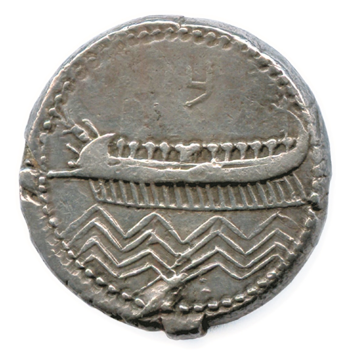 Galère avec douze rameurs voguant à gauche. Dessous, zig-zag marquant l'eau. Grenetis. R/. Le roi perse debout dans un char tiré par quatre chevaux et conduit par un aurige. Derrière, le roi de Sidon.