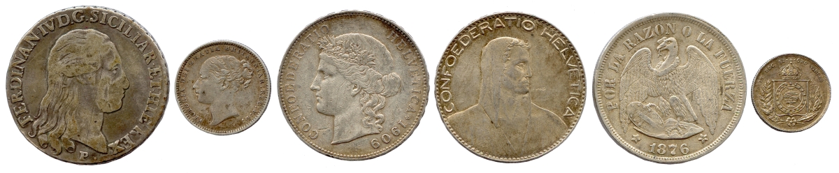 ITALIE Royaume de Naples Ferdinand IV Piastre de 120 grana 1798 A.P. ; GRANDE BRETAGNE Victoria Schilling 1883 ; CONFÉDÉRATION HELVÉTIQUE 5 Francs (tête de l’Helvétie) 1909 B et 5 Francs (Guillaume Tell) 1922 B ;