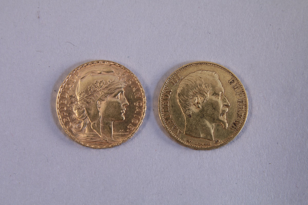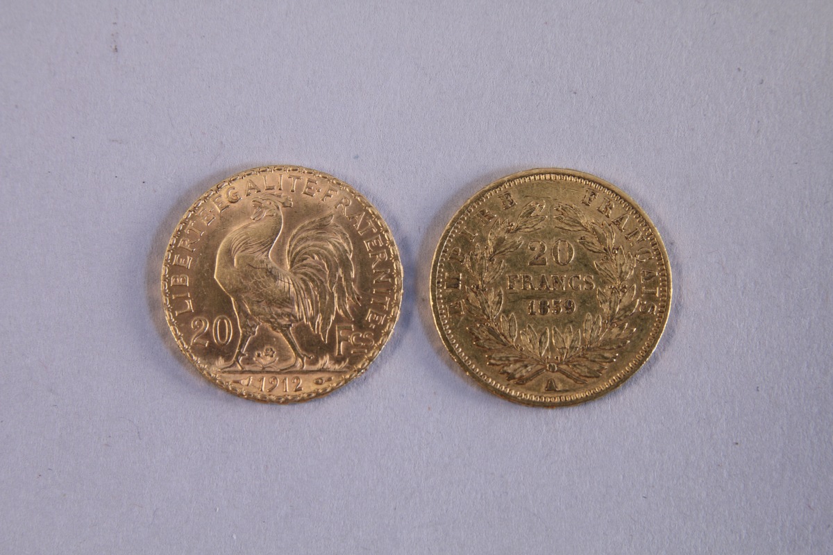 FRANCE. DEUX PIÈCES de 20 FRANCS or : Napoléon III tête nue (Paris, 1859) et Coq (1912).