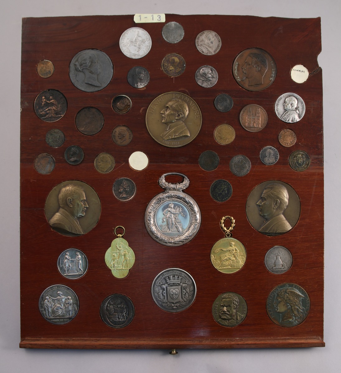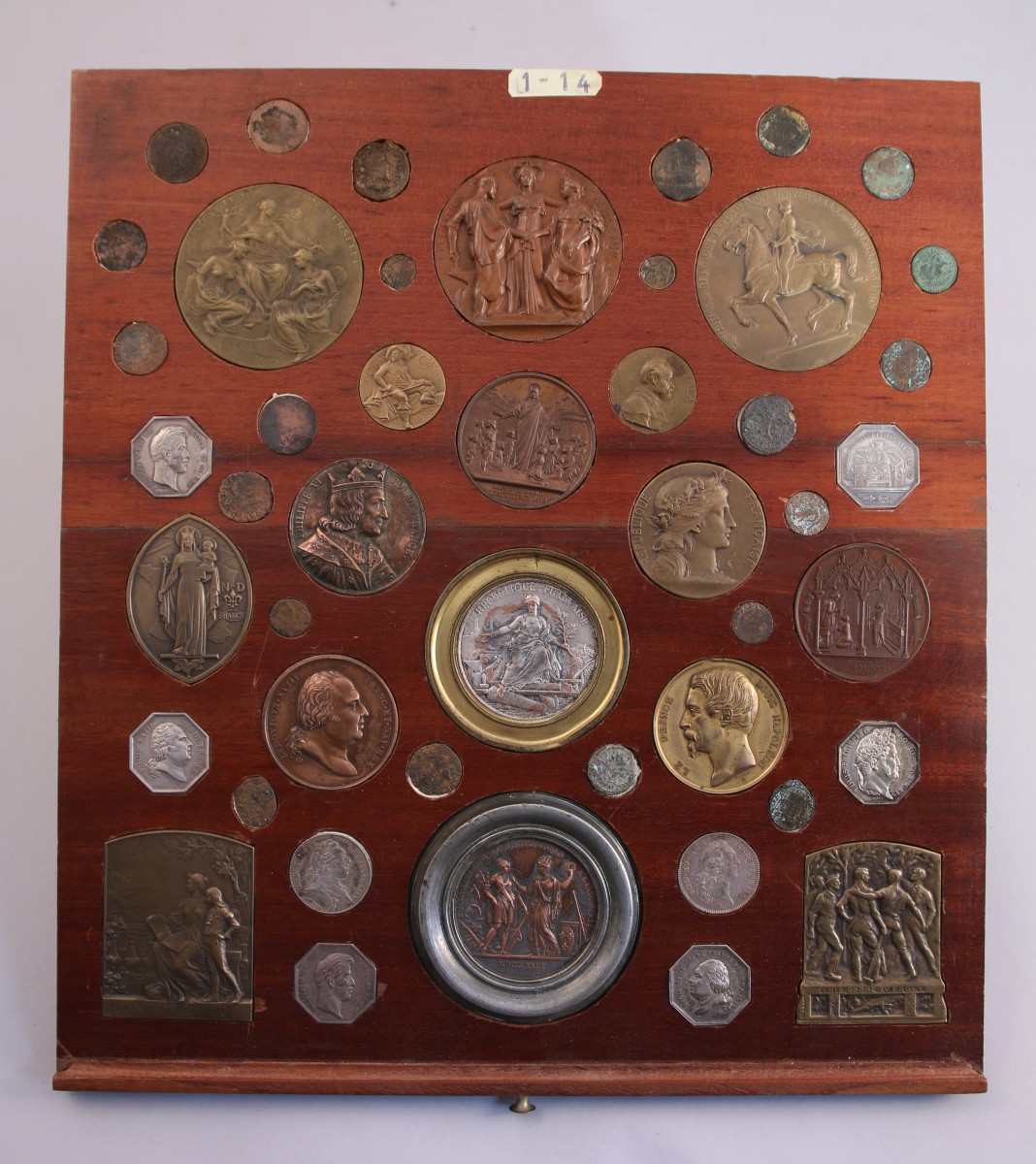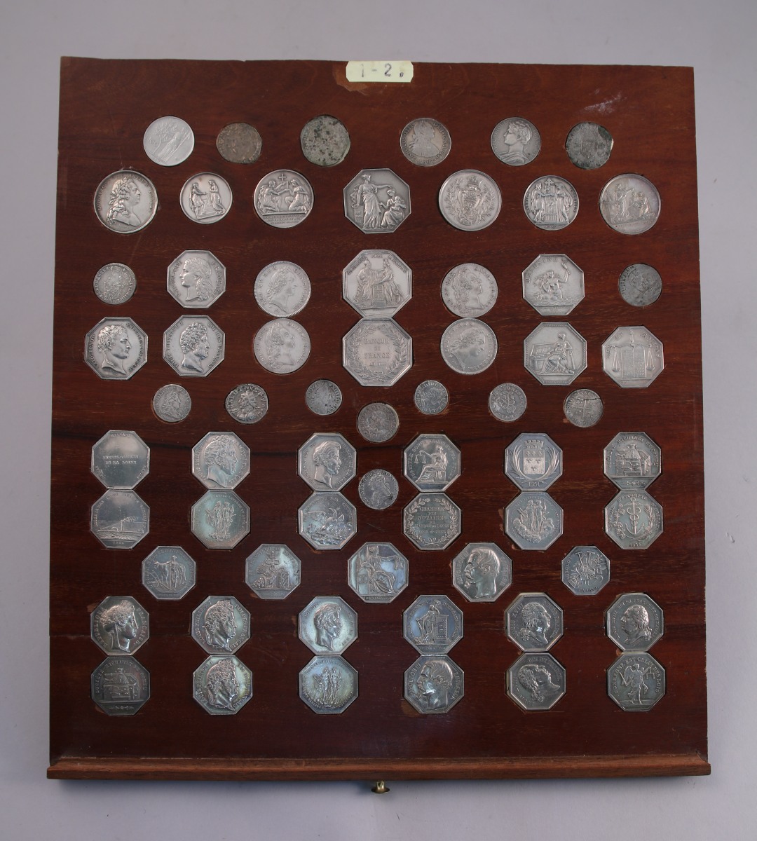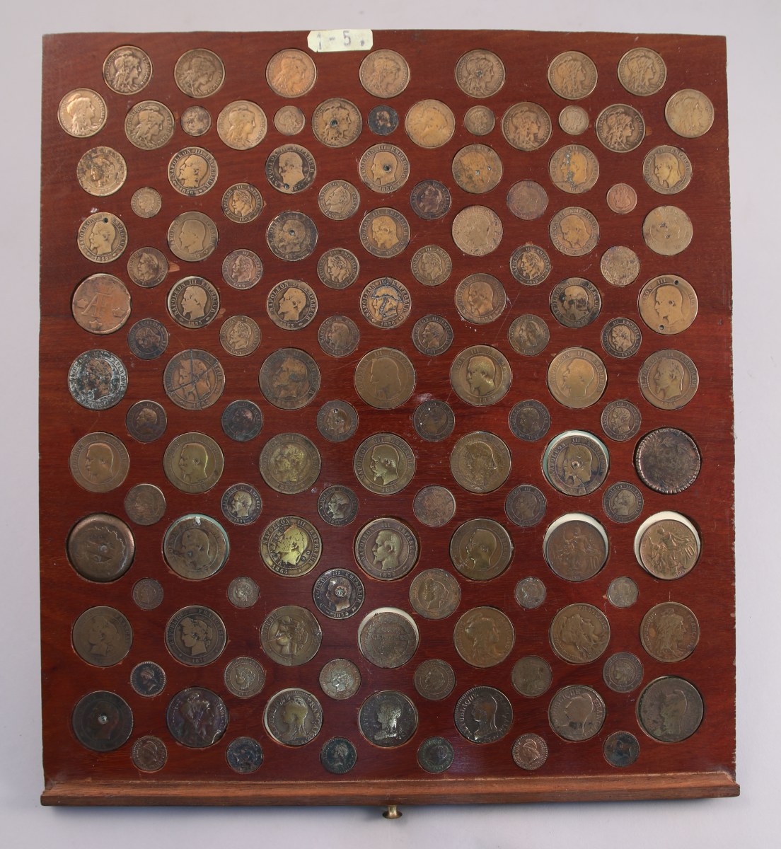COLLECTION de 21 plateaux présentant de nombreuses MONNAIES, France et Monde, de l'Antiquité à l'époque contemporaine. Certaines en argent. Cette collection comprend également de nombreux jetons de notaire et médailles. Dans un médailler.