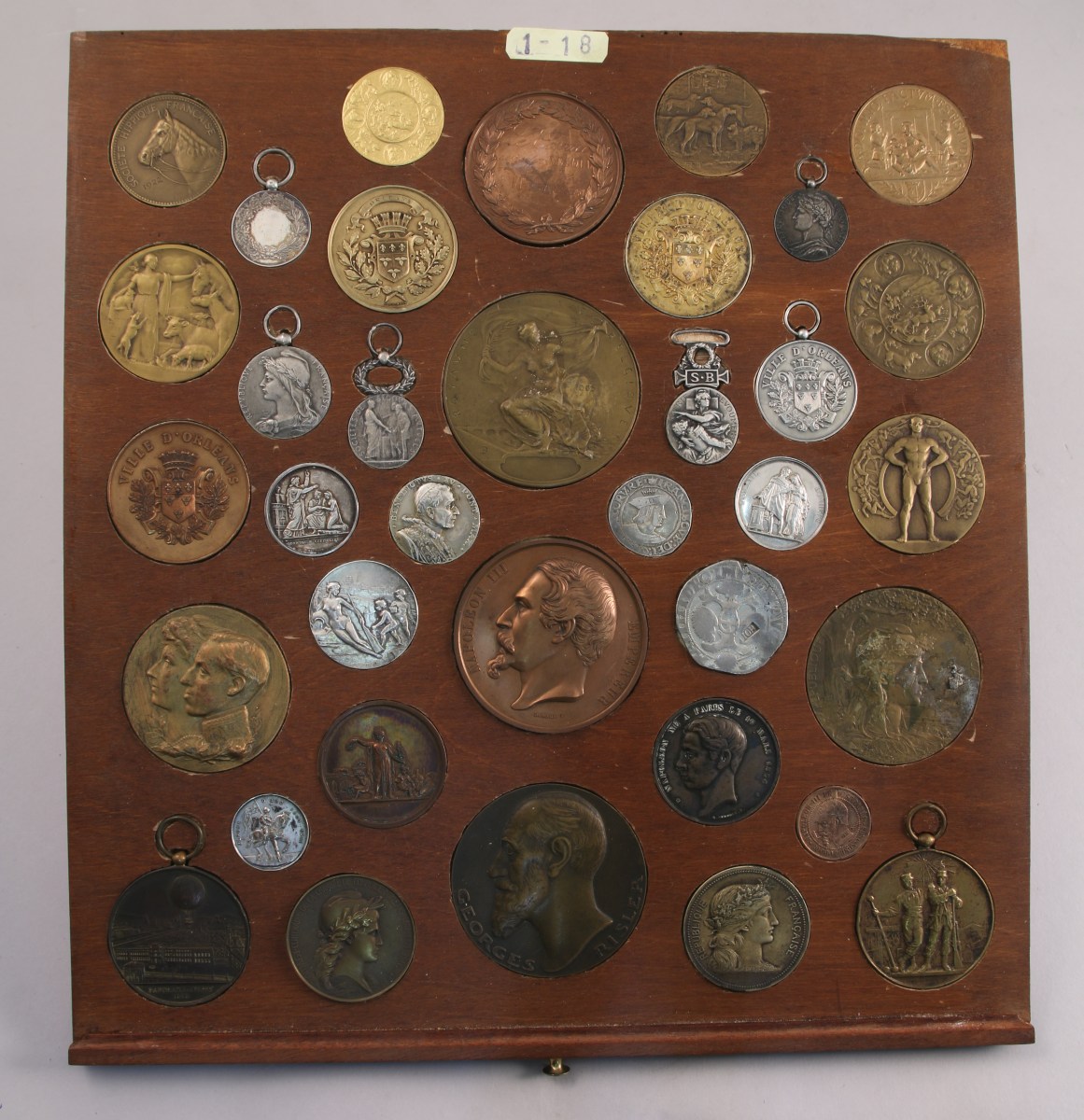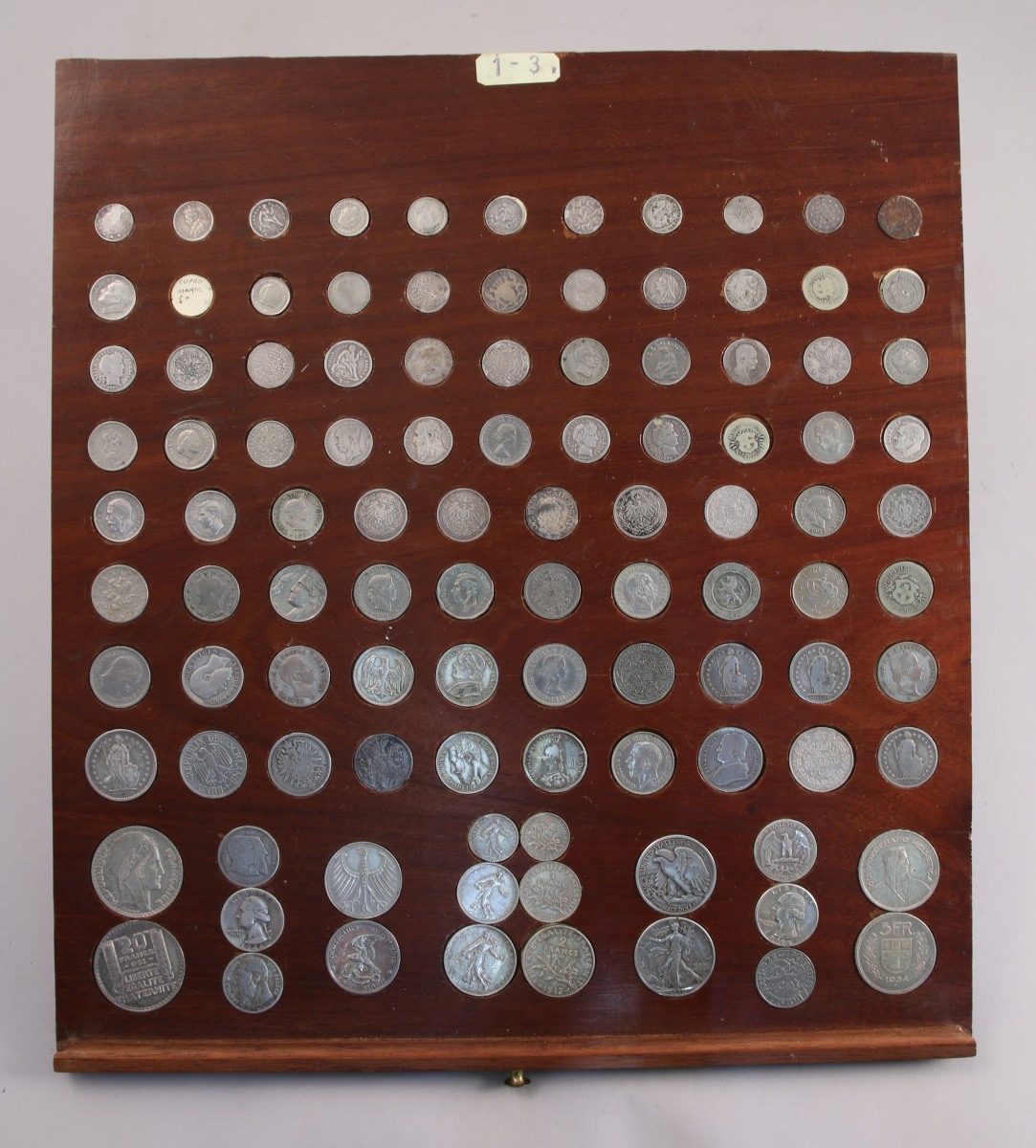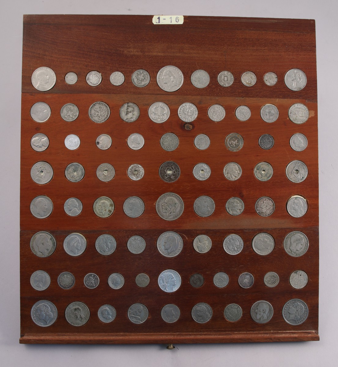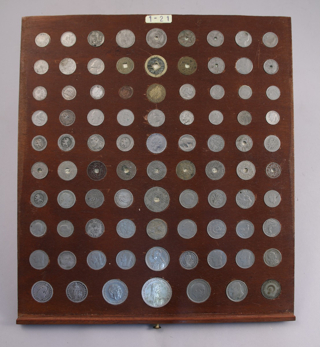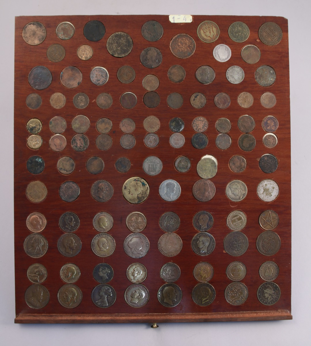 COLLECTION de 21 plateaux présentant de nombreuses MONNAIES, France et Monde, de l'Antiquité à l'époque contemporaine. Certaines en argent. Cette collection comprend également de nombreux jetons de notaire et médailles. Dans un médailler.