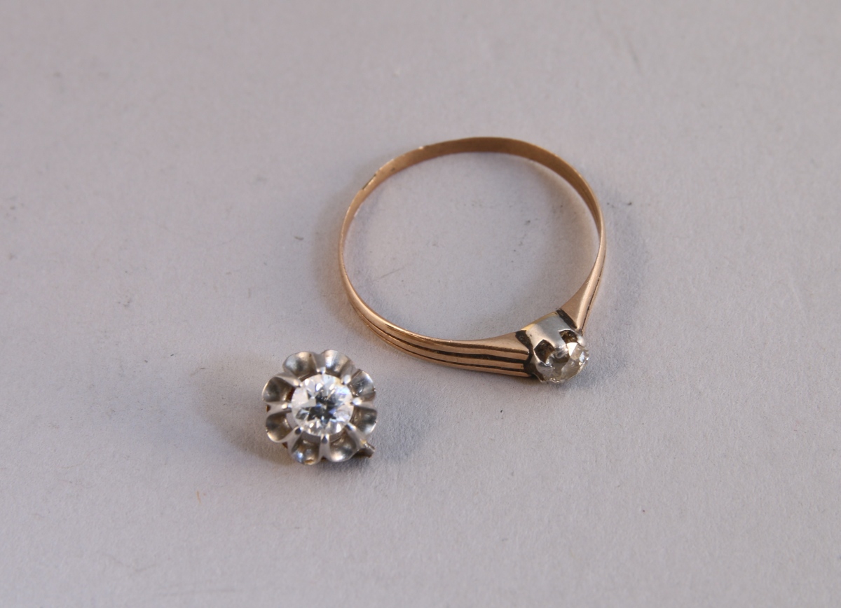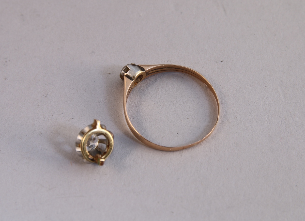 JOINT : BAGUE solitaire en or et platine sertie d'un petit diamant ancienne d'environ 0,15 carat. Poids brut : 1,3 g.
