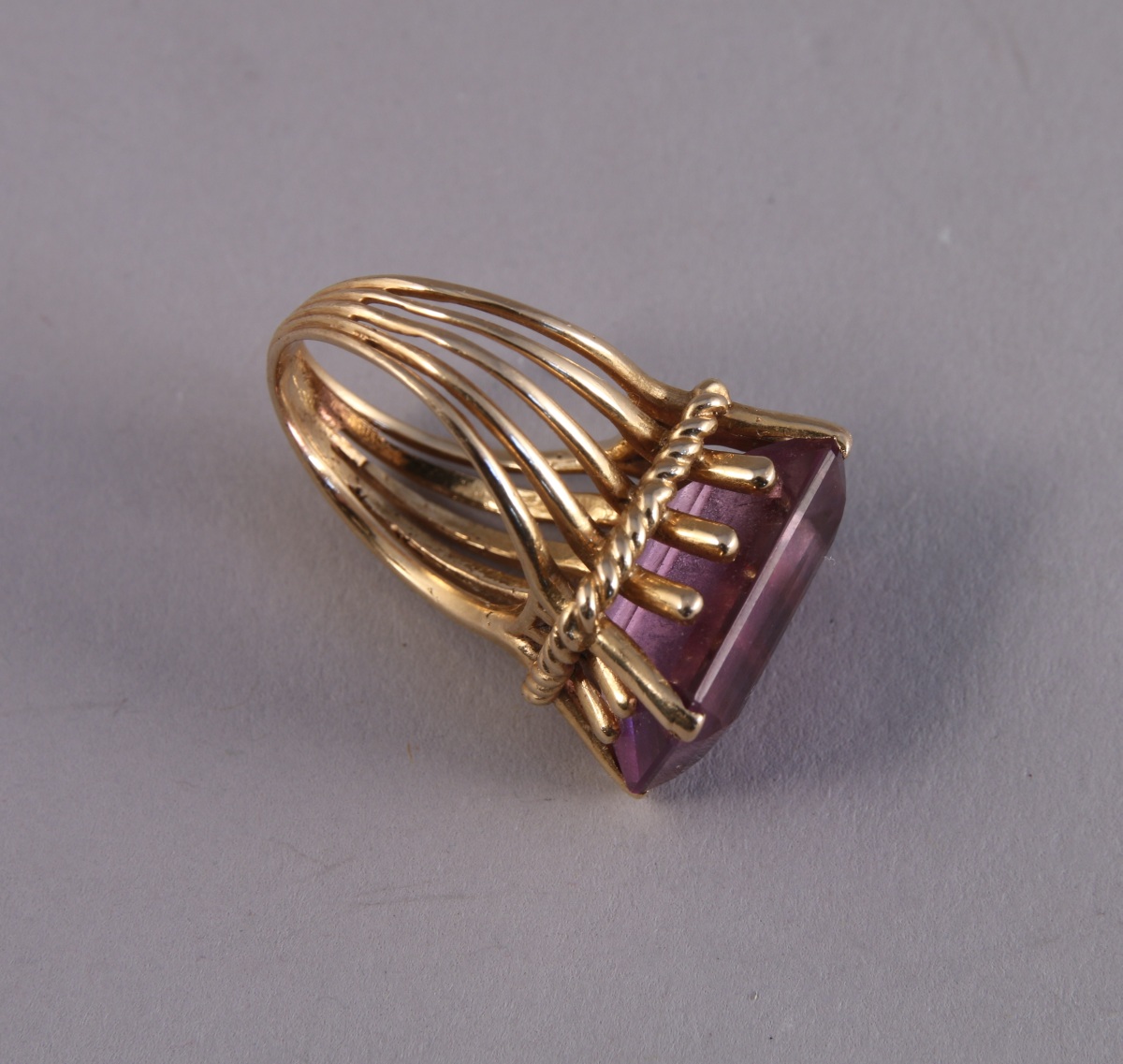 BAGUE en or jaune sertie d'une importante améthyste (?) taille émeuraude. Le chaton à griffes souligné d'une frise de câbles.