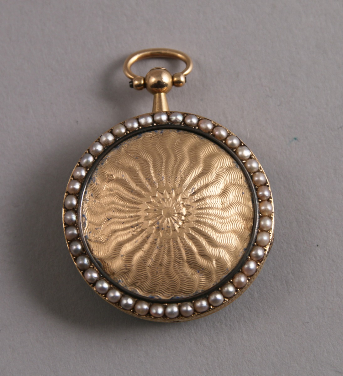MONTRE de COL à COQ en or, à clef à double boitier. Le cadran argenté indique les heures en chiffres romains, les aiguilles en acier bleui. Les boîtiers à décor d'un entourage de demi perles, le dos à décor d'un soleil rayonnant. Mouvement au coq ajouré et ciselé, échappement à verge.