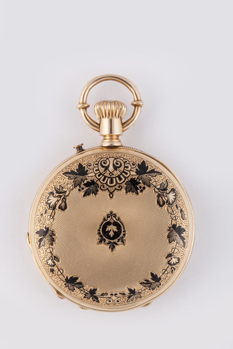MONTRE savonette à remontoir au pendant en or jaune. Boîtier guilloché à décor de feuillages émaillés noir sur le pourtour, et cartouche central monogrammé "SR". Double cadran émaillé (heures/minutes en chiffres romains et secondes) signé "N. Robert & Fils / Locle". La cache poussière et le mécanisme signés Numa Robert et fils Locle. Le mouvement numéroté 19090;