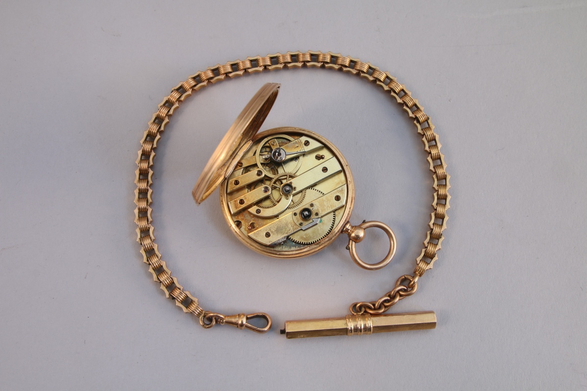 MONTRE de GOUSSET en or jaune au boitier guilloché entouré d'une guirlande fleurie avec un écusson. Cadran émaillé gradué pour les minutes avec les heures en chiffres romains. Remontoir à clé derrière la platine. Cache-poussière en or gravé "Cylindre 8 rubis".