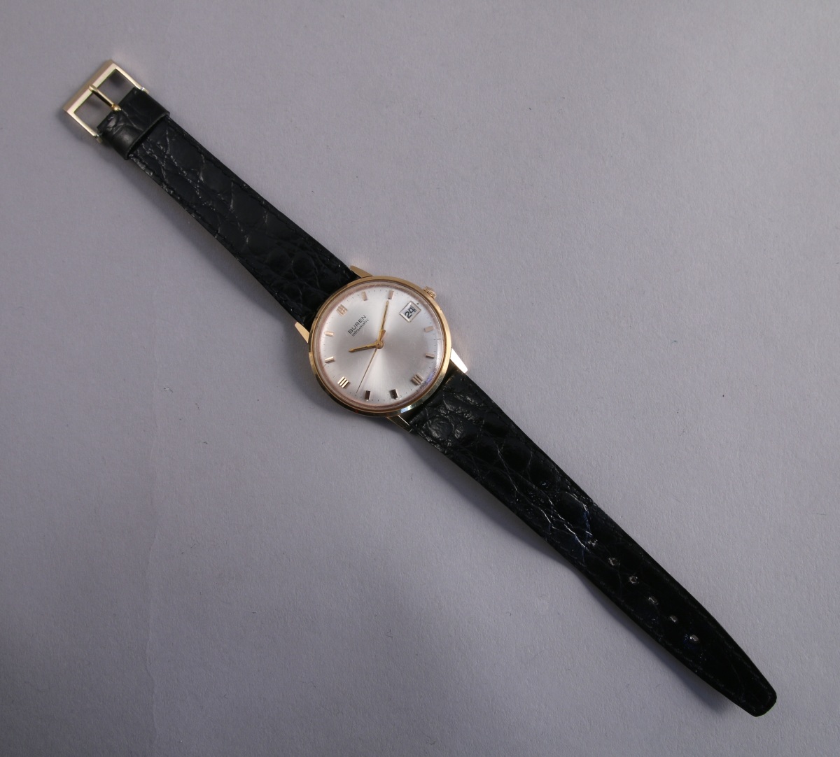 BUREN. MONTRE-BRACELET d'homme en or jaune. Modèle "intra-matic". Mécanisme à remontage manuel (accdt). Cadran métallique à index bâtonnets et guichet dateur. Boîtier numéroté 935702. Bracelet de cuir noir rapporté.