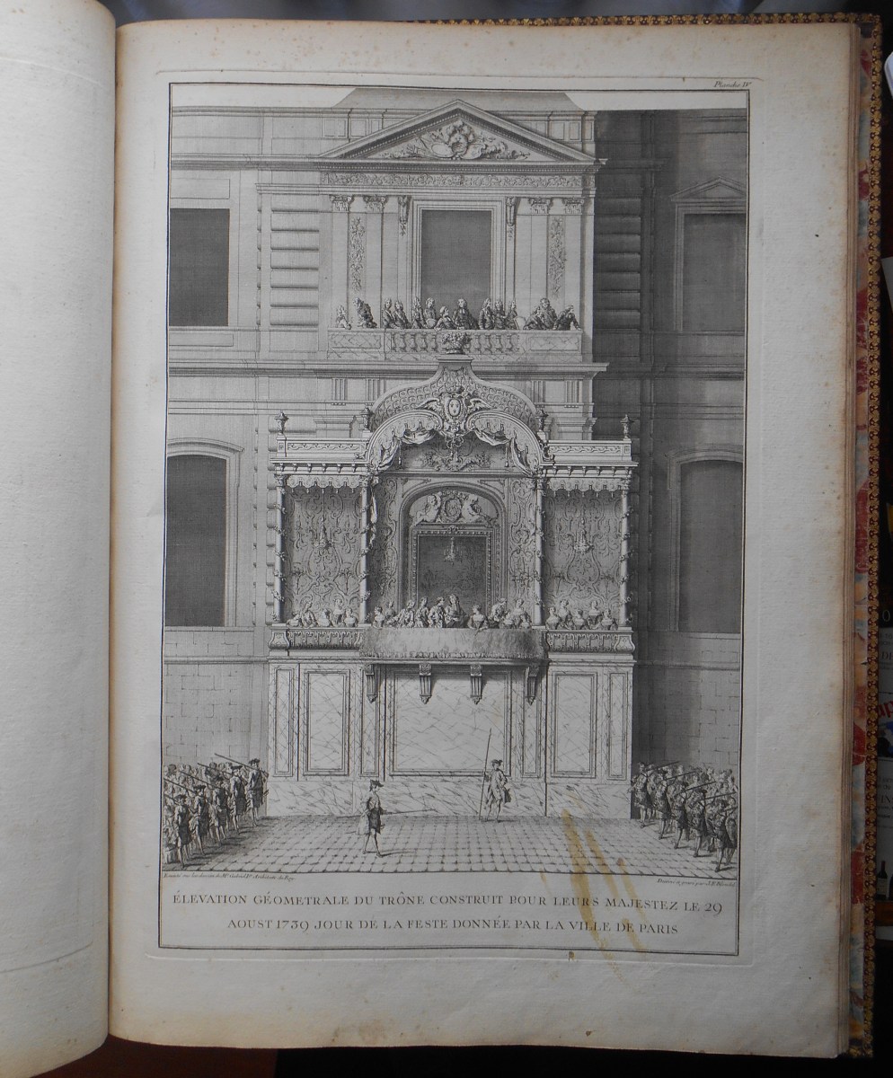 -13 planches et plans, dont 8 sur double page, dessinés ou gravés par Blondel, pour la plupart. Les planches doubles représentent entre autres les "décorations, illuminations et feux d'artifice de la feste donnée sur la rivière de Seine", et les vues intérieures de l'Hôtel de Ville "où sont représentées les décorations et illuminations de la cour où s'est donné le bal". Les installations, décorations et constructions pour les festivités publiques les bords de la Seine et sur la Seine ont été imaginées et dessinées par l'Italo-français Giovanni Niccolo Servandoni (1695-1766), peintre, architecte, décorateur de théâtre, directeur des machines de l'Académie Royale de Musique de Paris etc... (Cohen, 288)
