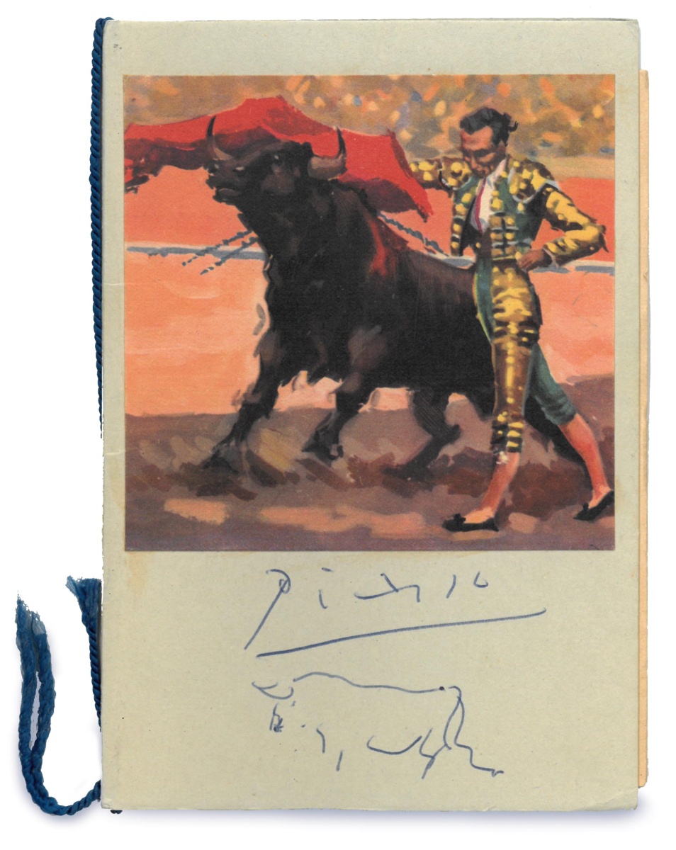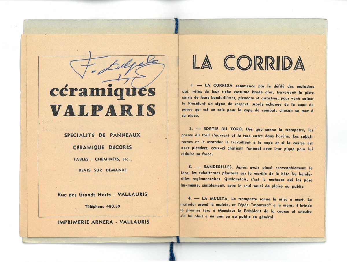 Sur la couverture du programme de la Fiesta taurine du 4 août 1957 «sous la présidence dhonneur de Pablo Picasso ». Livret de 8 pages réunies par une couverture cartonnée.